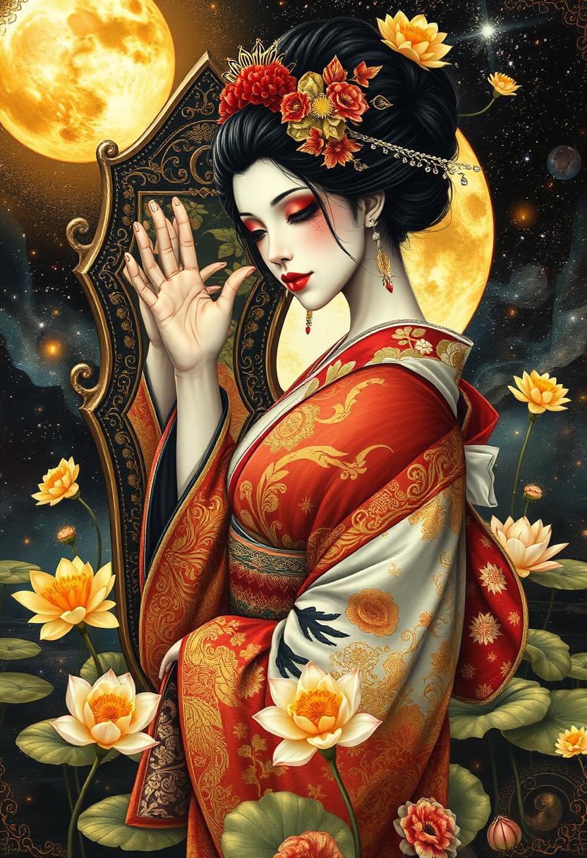 artistic style art, drawing panel Beautiful Geisha in black and white and red yellow golden dress touching a mirrored reflection of herself, intricate golden motifs, chrysanthemum and lilly and lotus pond, glowing outer space background, dark hair, dark fantasy, intricate details, hyper detailed, Jean Baptiste Monge, Carne Griffiths, Michael Garmash, seb McKinnon, masterpieceugly, tiling,