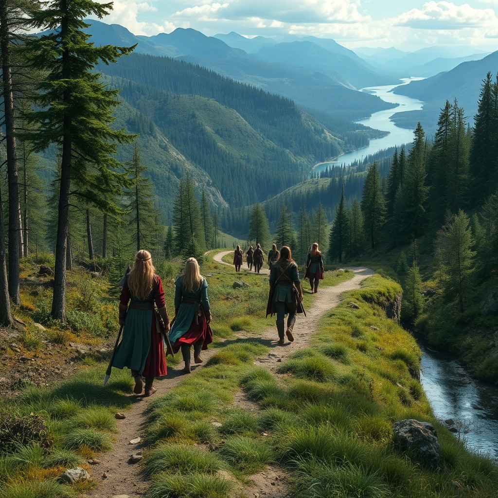 a group of female warriors travel a wide valley path through woodland, a broad river runs alongside the path, distant rivers, distant mountains, wilderness, dungeons and dragons, medieval, real photo, 4k, vibrant colours