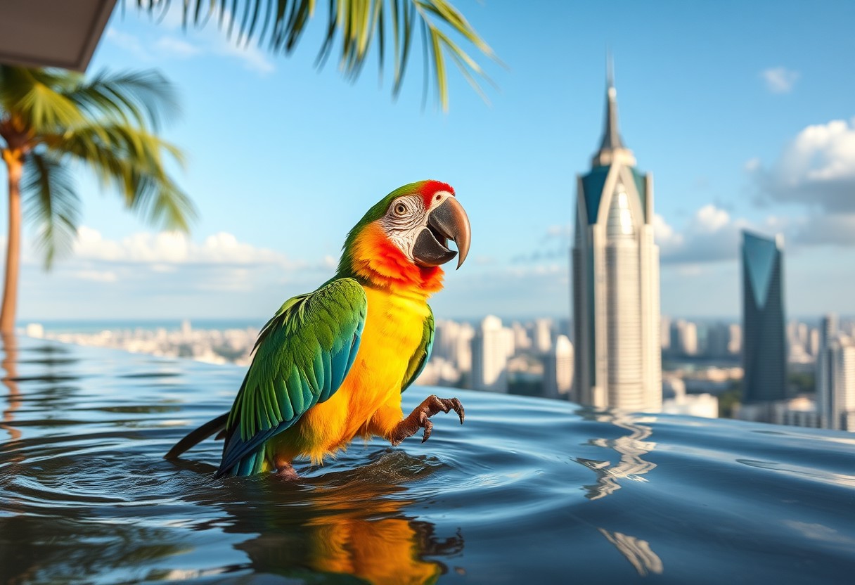 Happy parrot, playing in water, drinking, thristy, daylight penthouse, tropical city, morning, skyscraper, distant city,