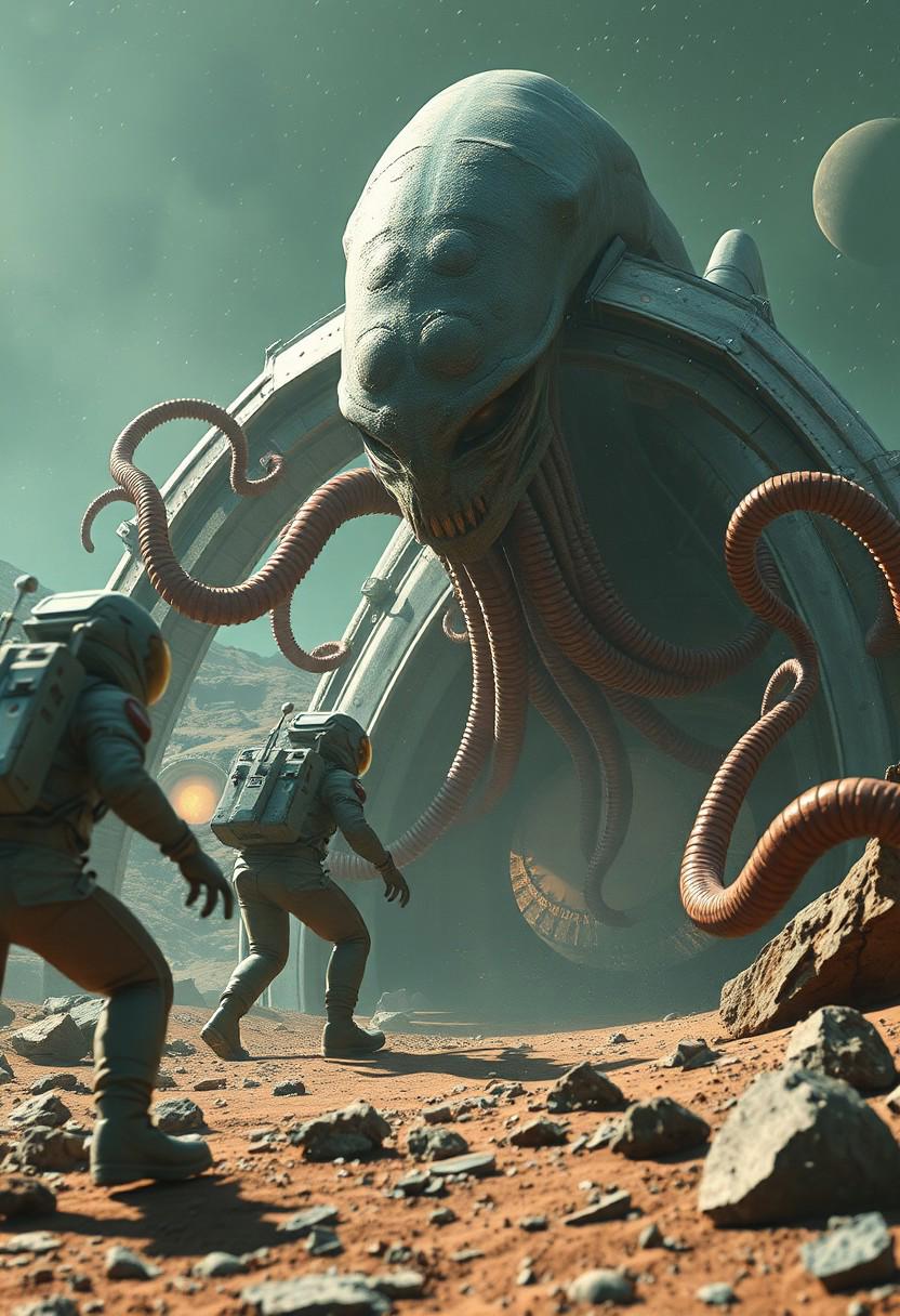 human astronauts enter a derelict alien ship on a distant planet and are viciously attacked by the alien lifeforms, alien morphed into squid, in the style of HR Giger, (vivid colors:1.6), photo-realistic, sharp details, (best quality:1.2), uhd, masterpiece, ultra-realistic, (best render:1.4), sharp detailed features,