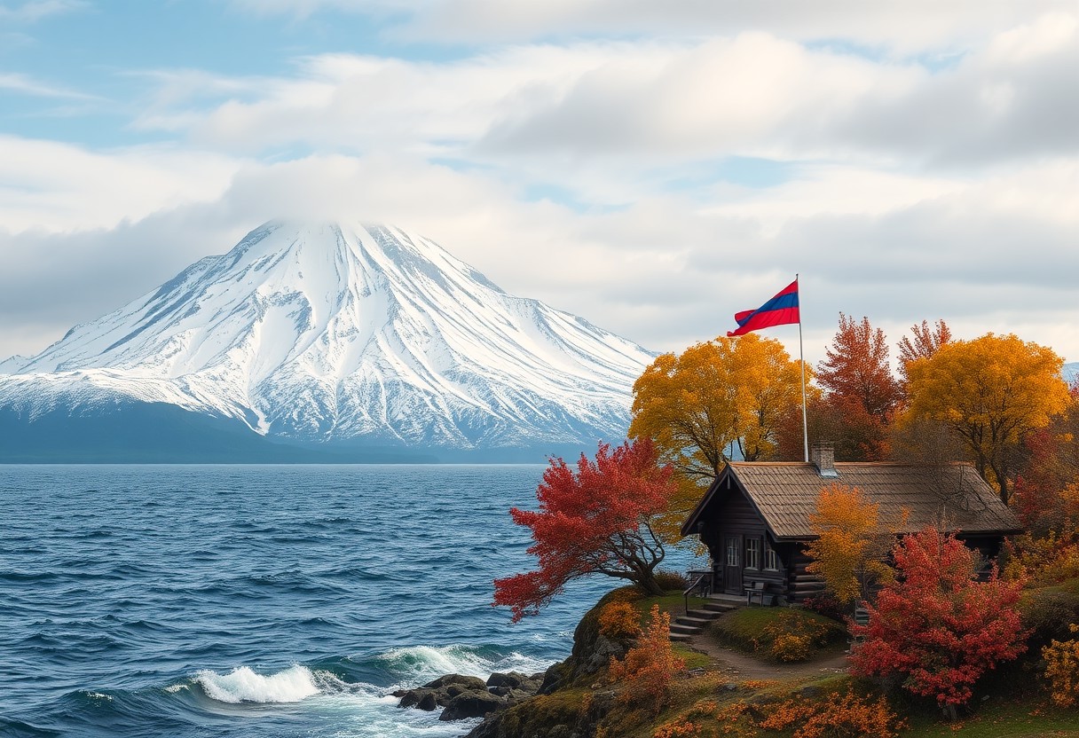 snow covered mountain ending in choppy sea, edge of land covered by fruit trees of various colors and a small brown cabin flying a red and blue flag.