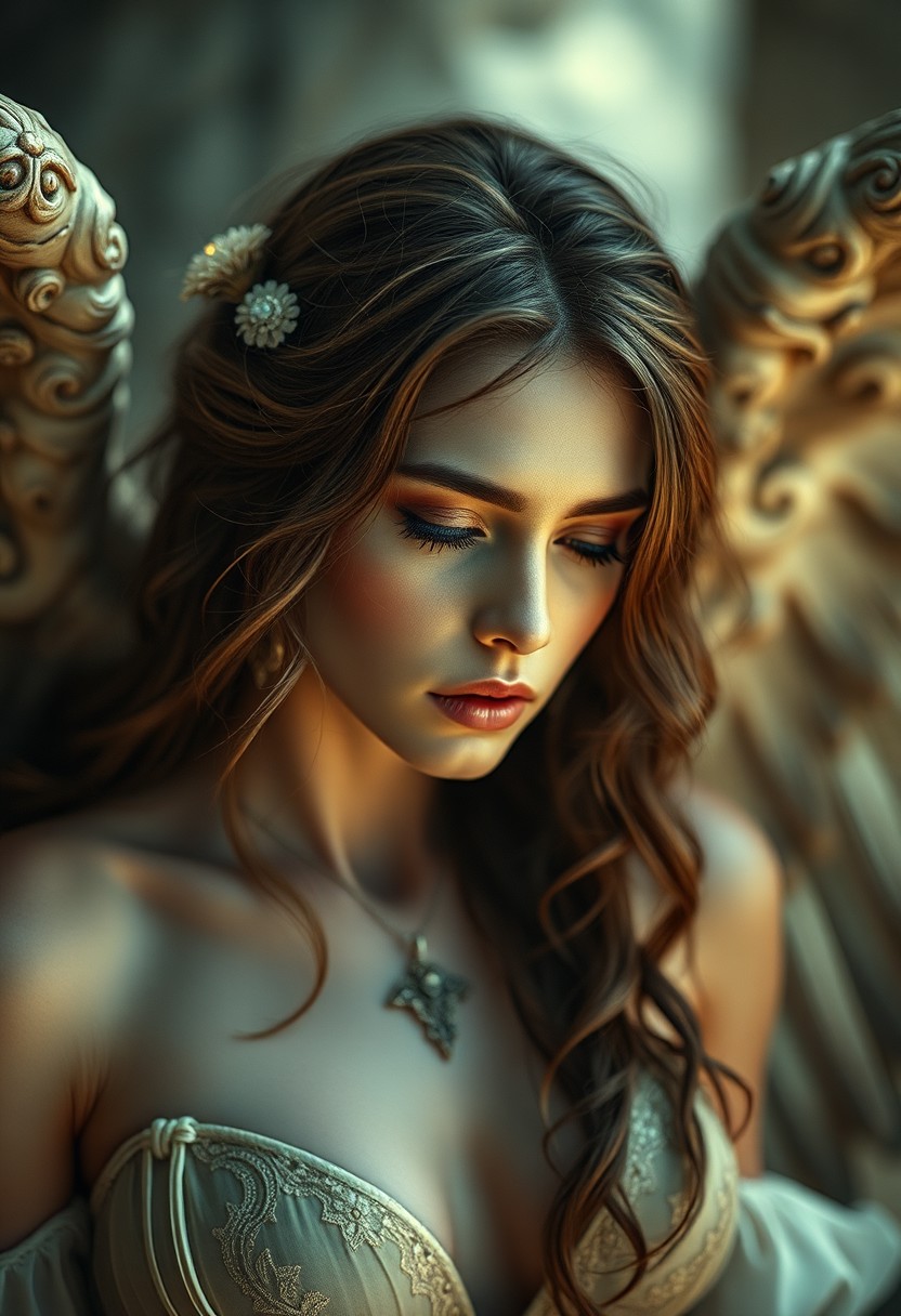 Masterpiece, hyperrealistic photograph, stunning ,THE angel of death raw captivating sensuality, 8K resolution, cinematic depth of field, soft bokeh, very aesthetic, alluring provocative sophisticated atmosphere, vignette.
