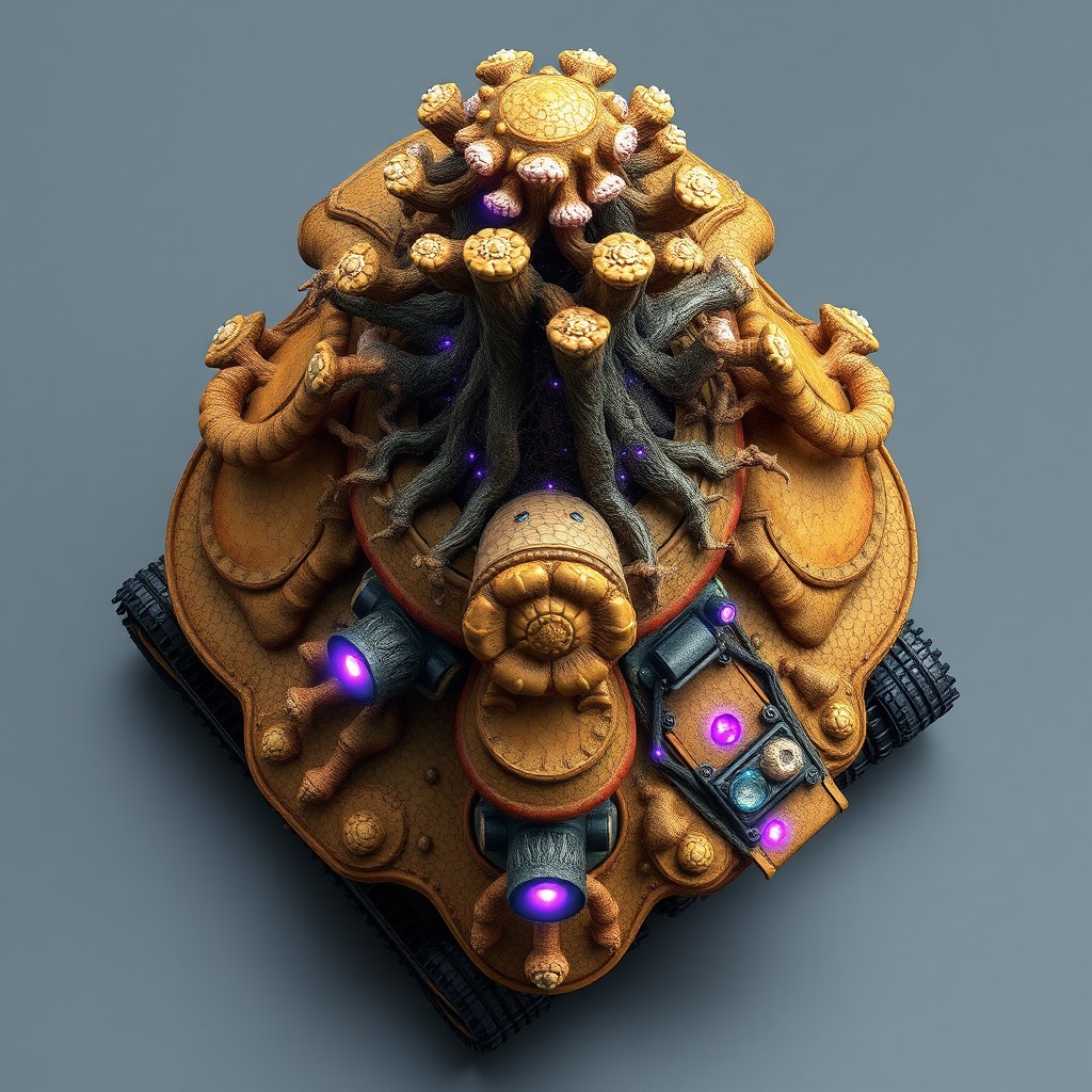 ((top view)), (tank), Tall tank with fungal tower rising from the center and spreading cap-like armor out over the body. Chassis: Coral-like chitin plating, semi-organic with branching root textures. Slight iridescence in shifting light. Tracks: Short, stocky treads with fungal lattice stabilizers over each corner. Details: Central tower leaks bio-mist during idle. Crust-like armor plates pulse faintly as mycelial network reconfigures. Lights: Purple luminescence from fungal nodes. Spore lamps blink in repeating bio-patterns.
