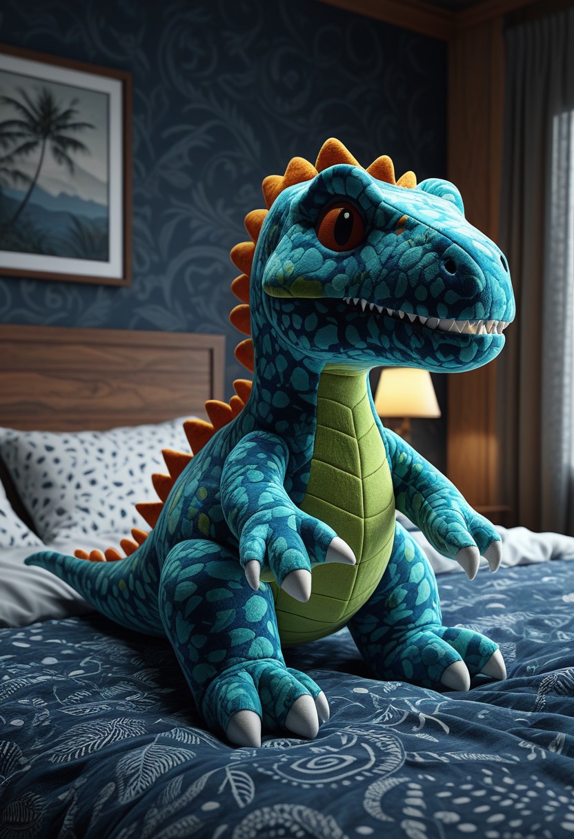 a cute plush t-rex dinosaur made out of batik fabrics, on the bed, cozy room background, masterpiece, 8k, octane render, ultra detailed, cinematic, Masterpiece, 3d octane render, hyperrealistic, High Detail, moody