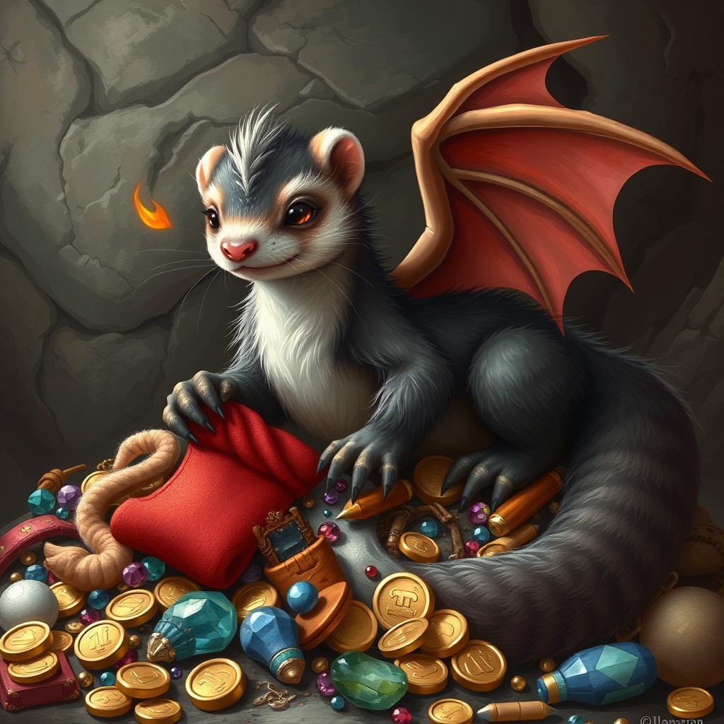 A dragon ferret hybrid, a furry dragon with ferret features, a ferret evolved into a dragon, stealing a rolled up sock, hoarding trinkets and toys mixed with treasure, grabbing red sock, grey brown and white colored fur, furry tail, dragon wings, little flames coming out of nose, laying on top a pile of hoarded treasure which includes gold coins gems socks and plushies, cave background