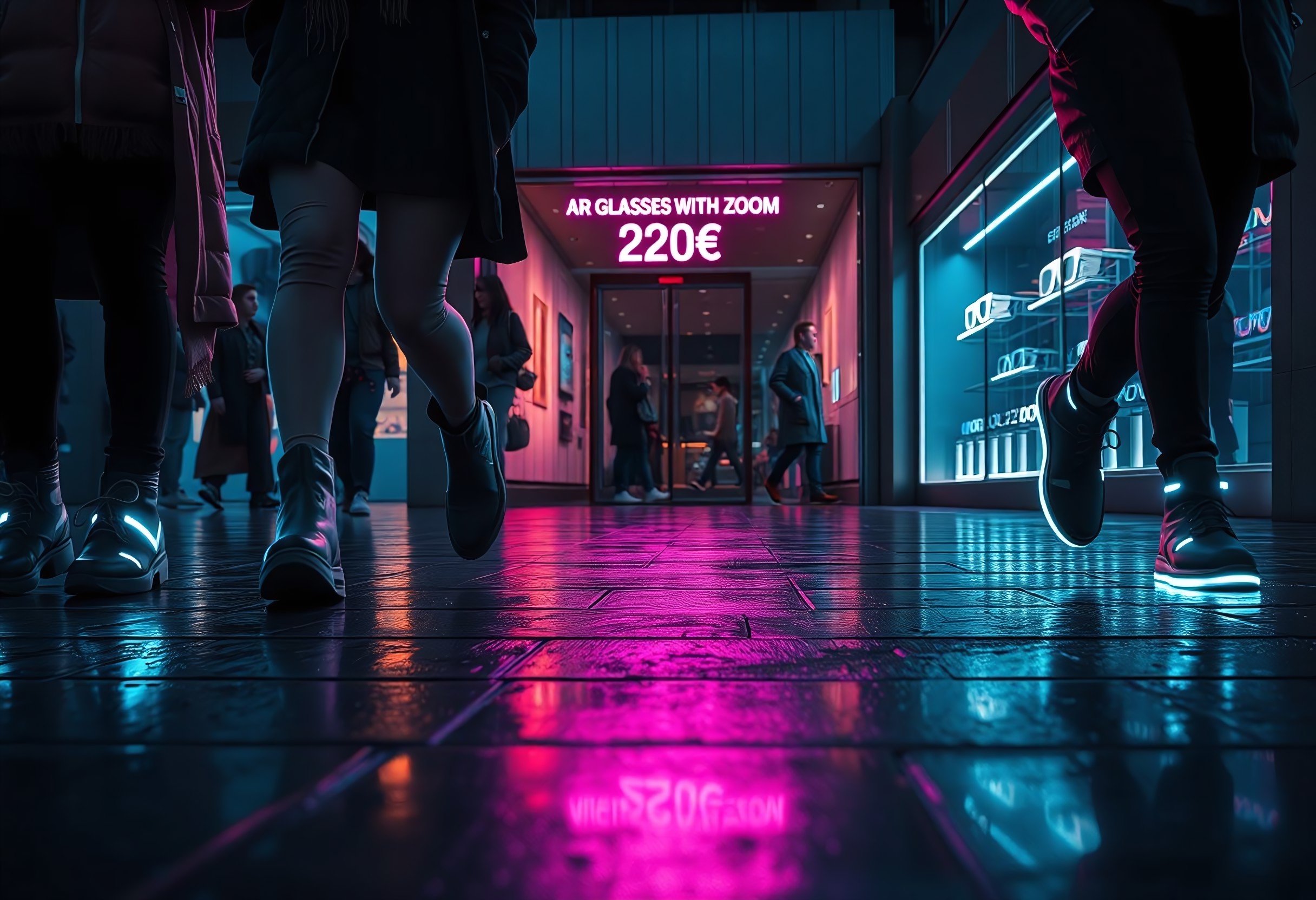 A dark, atmospheric scene set in the near future, during nighttime in a slightly dystopian European shopping street. The camera is placed low on the ground, capturing only the legs and shoes of passing pedestrians as they walk by in both directions. People wear futuristic fashion, sleek boots, LED-trimmed sneakers, and tech-enhanced clothing. Neon reflections ripple across the pavement. In the background, the camera is pointed toward the entrance and display window of a sleek, modern tech store. A glowing digital sign in the window advertises “High-Tech AR Glasses with Zoom – Only 200€” in bold, animated letters. The shop has a minimalistic but high-end look, with smart-glasses on display behind clean glass and interactive holographic interfaces flickering gently. Subtle sounds of city ambience and quiet electronic music in the background. Cinematic mood, dim lighting with blue and violet neon tones, cyberpunk undertone, rainy urban vibe, realistic animation, close-up street-level perspective.