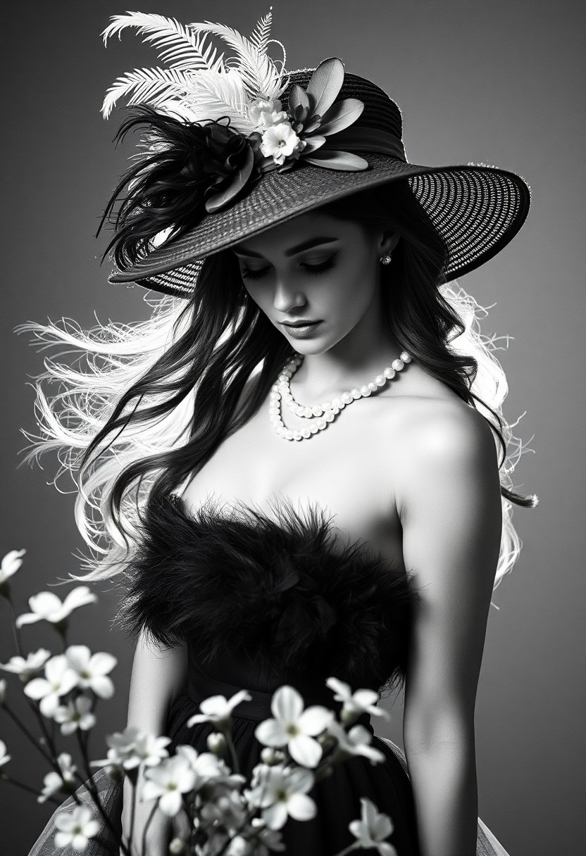 A breathtakingly black nad white dynamic scene of a stunning woman illuminated by soft film lighting and voluminous highlights against a photogenic backdrop. A masterpiece captured through the eyes of a 35mm camera, with her head bowed and the decoration of her hat in focus. Her stylish ball mini dress is delicately adorned with feathers, ((Her flowing hair hair flows down to her waist, styled in delicate waves)). Porcelain skin, Meanwhile, simple pearl earrings and a pearl necklace contrast with the gorgeous hat, further enhancing her amazing presence as she strikes a rebellious pose with a free gaze in a surreal atmosphere]], White flowers adorn the foreground. AI-Studio.