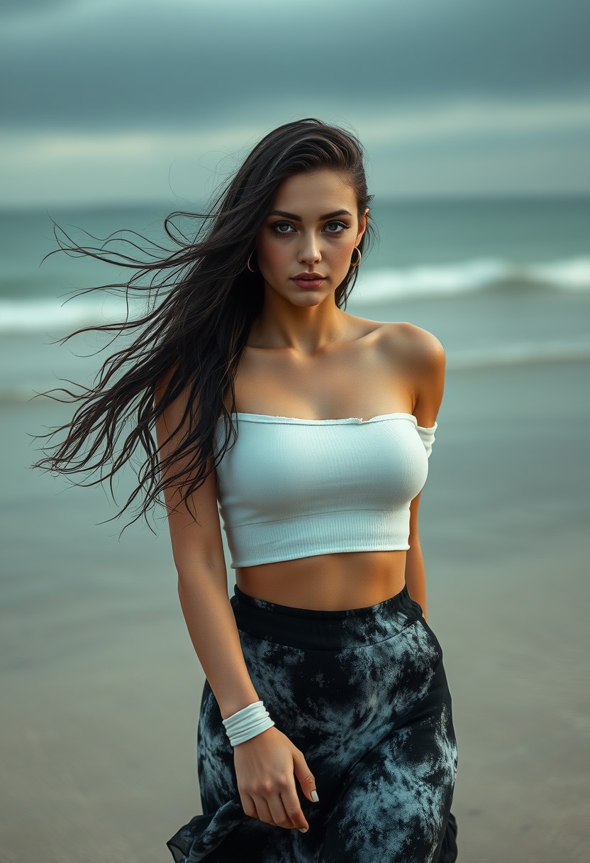 lazypos, 1girl, detailed eyes, (pretty face), (detailed face), rating_explicit, rating_nsfw, (sexy:1.5), medium breasts, (perfect body:1.5), photo-realistic, realistic skin, realistic textures, detailed skin, photorealistic, ultrarealistic, 8k, (slender, lean, fit, athletic:1.5), A photo-realistic shoot from a frontal camera angle about a woman standing on a beach with wet hair blowing in the wind, wearing a torn off-the-shoulder top and a tie-dye skirt. the image also shows a serene and moody atmosphere. on the middle of the image, a 20-year-old woman appears to be looking directly at the viewer with a neutral expression. she has long, wavy black hair that falls down her back, and her eyes are a deep blue. her body is slim and she is wearing a white, off-shouldered crop top that is partially torn, revealing her bare shoulders. she is also wearing a black, ruffled skirt that falls just above her knees. the background features a blurred ocean and a cloudy sky, creating a sense of depth and atmosphere. the lighting is soft and natural, casting gentle shadows on her face and body. the overall effect is one of serenity and vulnerability. 1girl, solo, rating:sensitive, long hair, black hair, looking at viewer, pants, torn clothes, outdoors, realistic, blurry, messy hair, blurry background, shirt, lips, bracelet, bare shoulders, day, cowboy shot, jewelry, sky, midriff, blue eyes,