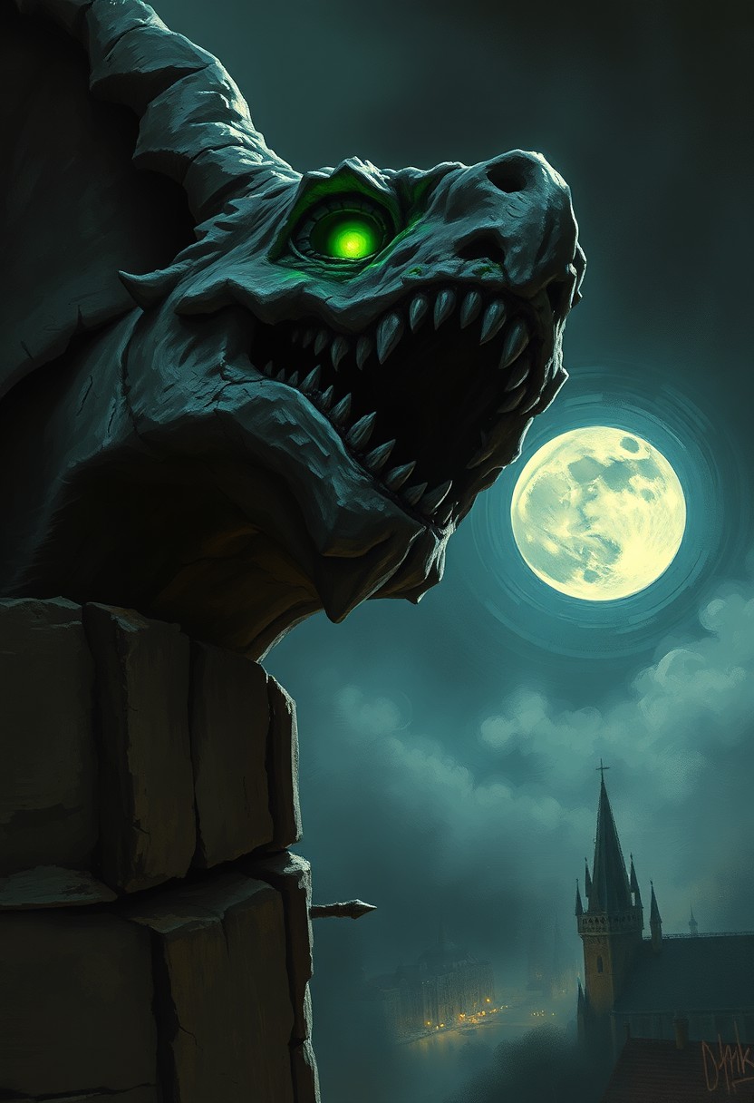 Painterly dark fantasy illustration, style of Brom and Zdzisław Beksinski. Low-angle close-up: Ancient stone gargoyle's head tilts upward, baleful phosphorescent green eyes glowing intensely from deep sockets. Weathered, pitted stone covered in grime and faint moss, rendered with visible, textured brushstrokes. Dramatic moonlight carves sharp highlights against abyssal shadows. Swirling nocturnal mist clings to the cathedral spire perch. Atmosphere of brooding menace, ancient sentience awakened. Hints of distant, blurred medieval city lights far below.