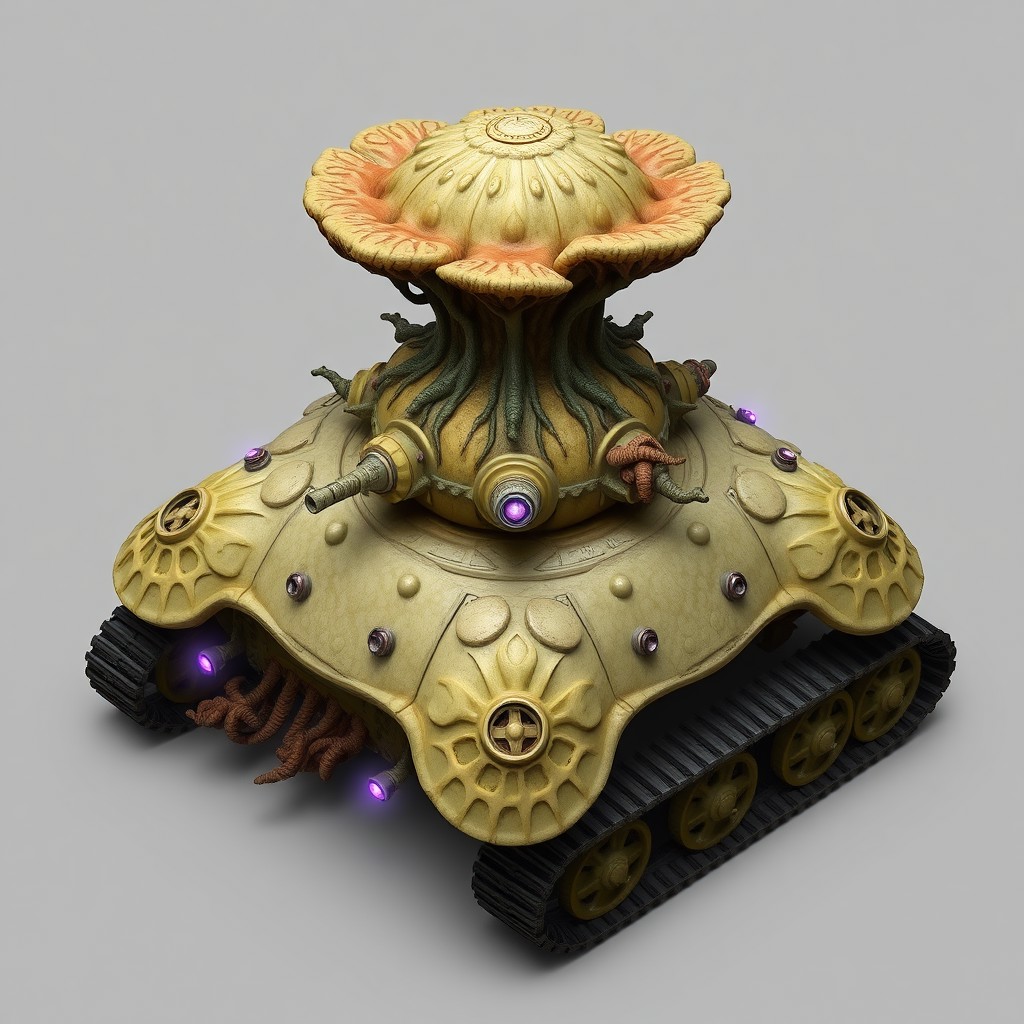 ((top view)), (tank), Tall tank with fungal tower rising from the center and spreading cap-like armor out over the body. Chassis: Coral-like chitin plating, semi-organic with branching root textures. Slight iridescence in shifting light. Tracks: Short, stocky treads with fungal lattice stabilizers over each corner. Details: Central tower leaks bio-mist during idle. Crust-like armor plates pulse faintly as mycelial network reconfigures. Lights: Purple luminescence from fungal nodes. Spore lamps blink in repeating bio-patterns.