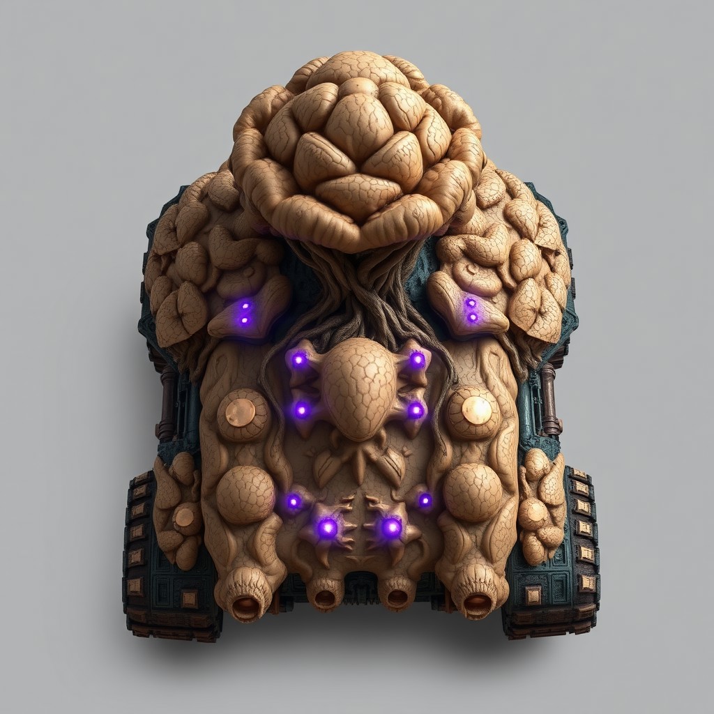 ((top view)), (tank), Tall tank with fungal tower rising from the center and spreading cap-like armor out over the body. Chassis: Coral-like chitin plating, semi-organic with branching root textures. Slight iridescence in shifting light. Tracks: Short, stocky treads with fungal lattice stabilizers over each corner. Details: Central tower leaks bio-mist during idle. Crust-like armor plates pulse faintly as mycelial network reconfigures. Lights: Purple luminescence from fungal nodes. Spore lamps blink in repeating bio-patterns.