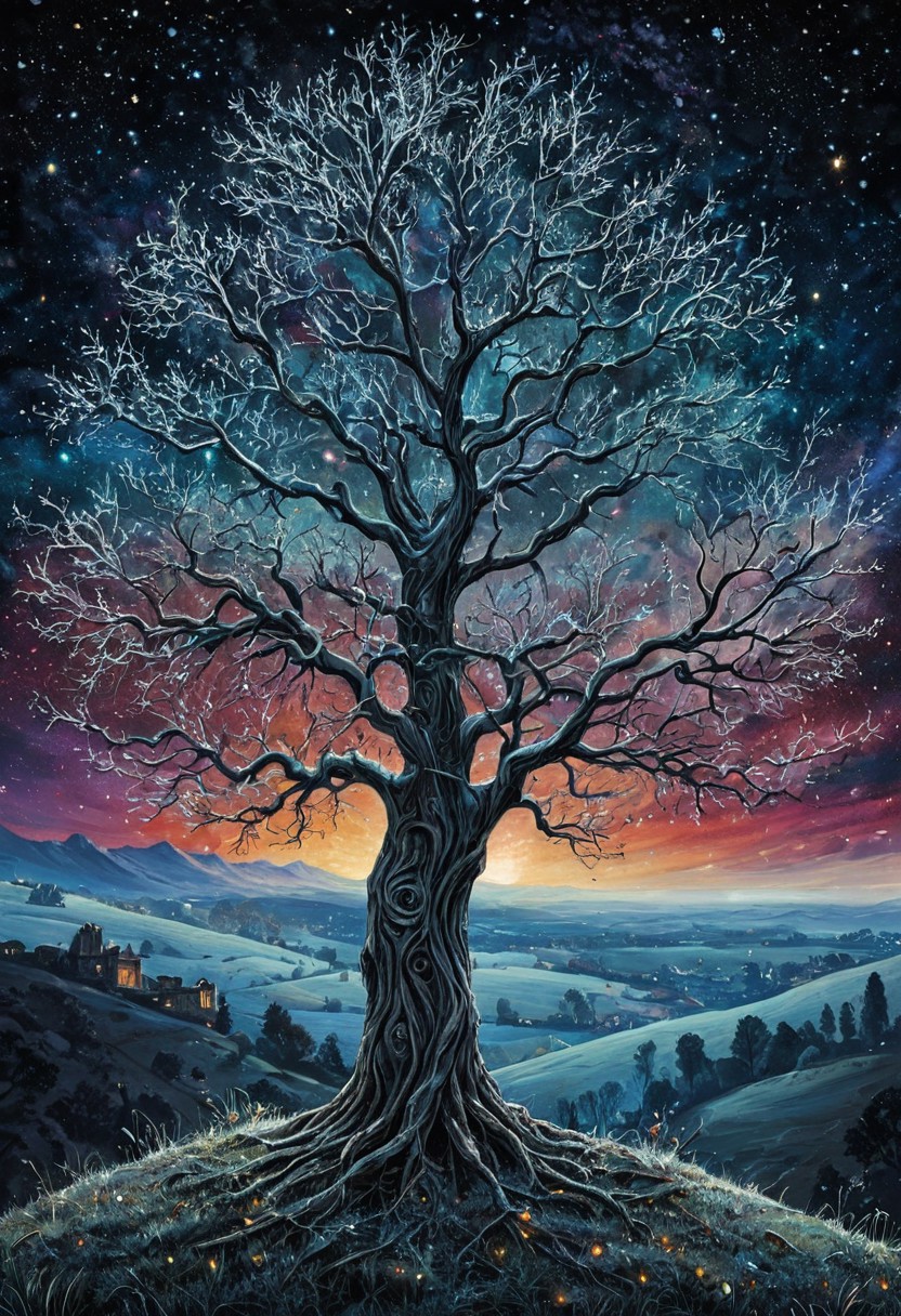 on a timeless hilltop the tree of years, its fragile leaves glistening with frost, spreads its ancient branches in silent applause to the majestic heavens, stars beyond number a backdrop to a celestial concert set in an inky black sky. Fantasy artwork, vibrant colours, sharp focus