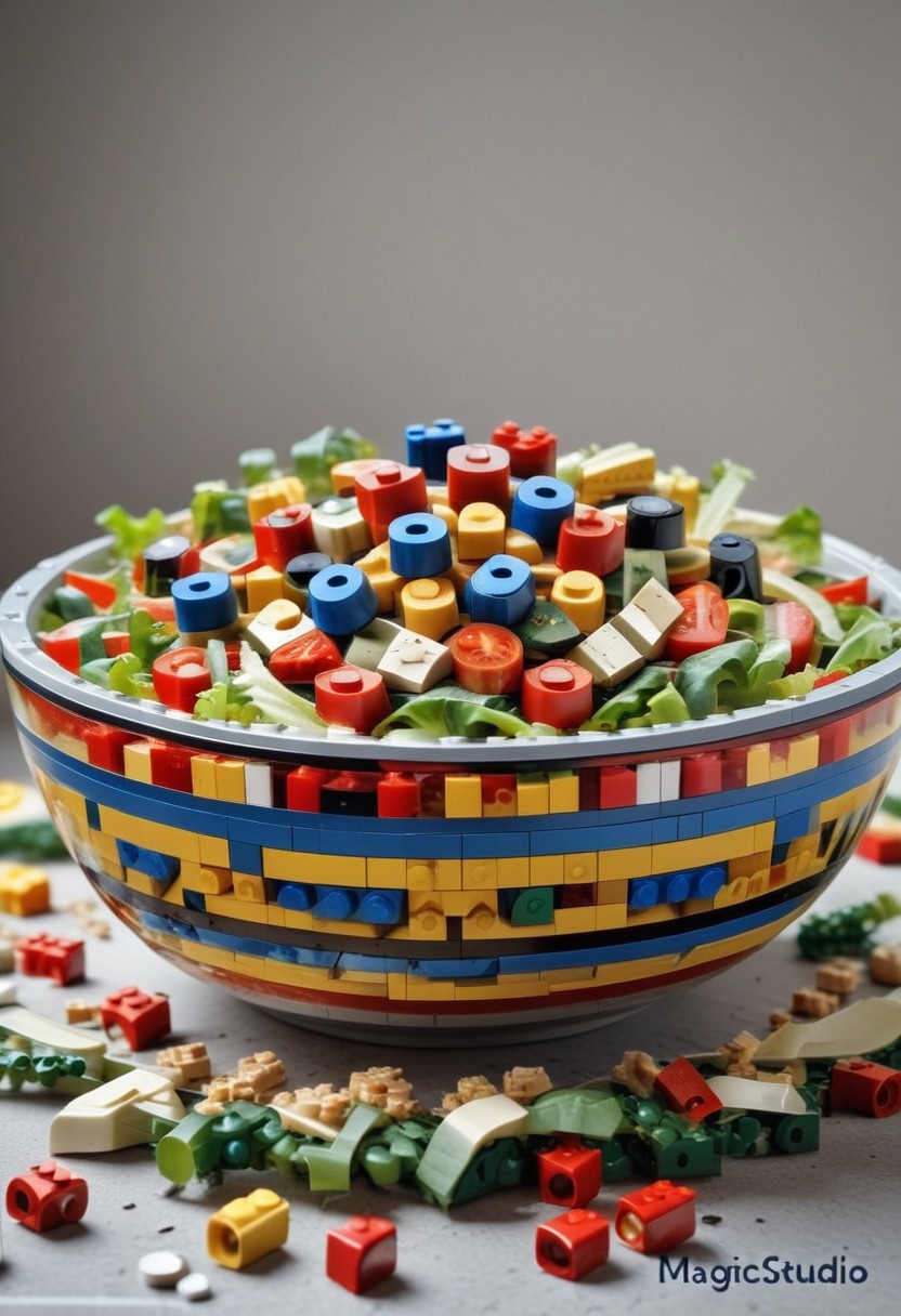 LEGO, depth of field, bokeh, 4K, HDR. hyper realistic, (absurd res:1.1), beautiful lighting, score_9, score_8_up, score_7_up, score_6_up, masterpiece, high quality, (best quality:1.1), (salad made from lego:2).
