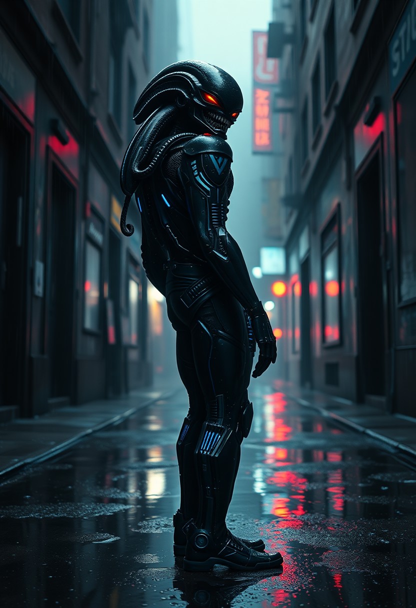 A gritty, photorealistic science fiction film style. Dark, moody ambiance with neon highlights and volumetric fog. A low-angle, medium shot of a menacing alien warrior standing in a dystopian city alleyway. The alien has bio-luminescent markings and sleek black armor with glowing blue circuitry. Rain is slicking off the armor, with puddles reflecting the city lights. The alien turns its head, revealing glowing red eyes and a snarling expression.