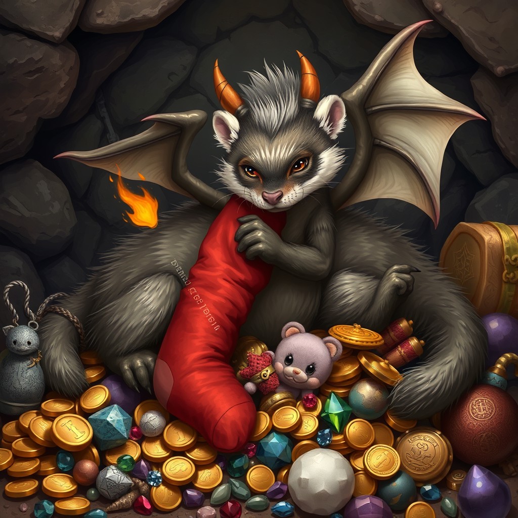 A dragon ferret hybrid, a furry dragon with ferret features, a ferret evolved into a dragon, stealing a rolled up sock, hoarding trinkets and toys mixed with treasure, grabbing red sock, grey brown and white colored fur, furry tail, dragon wings, little flames coming out of nose, laying on top a pile of hoarded treasure which includes gold coins gems socks and plushies, cave background