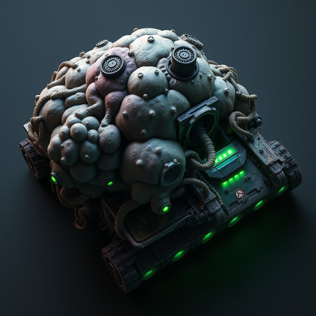 ((top view)), (tank), Asymmetrical organic tank with massive growth bulges on one side and a withered shape on the other. Chassis: Tumor-like armor patterns with tendrils and armored cysts. Surface ripples gently like breathing tissue. Tracks: Thick, uneven track system with root-like armor entwining gear shafts. Details: Regenerates armor chunks visibly. DNA-splicer node juts out near rear, framed in armor plates. Lights: Sickly green and purple bio-glow from within bulges. Glows brighter when sustaining damage.