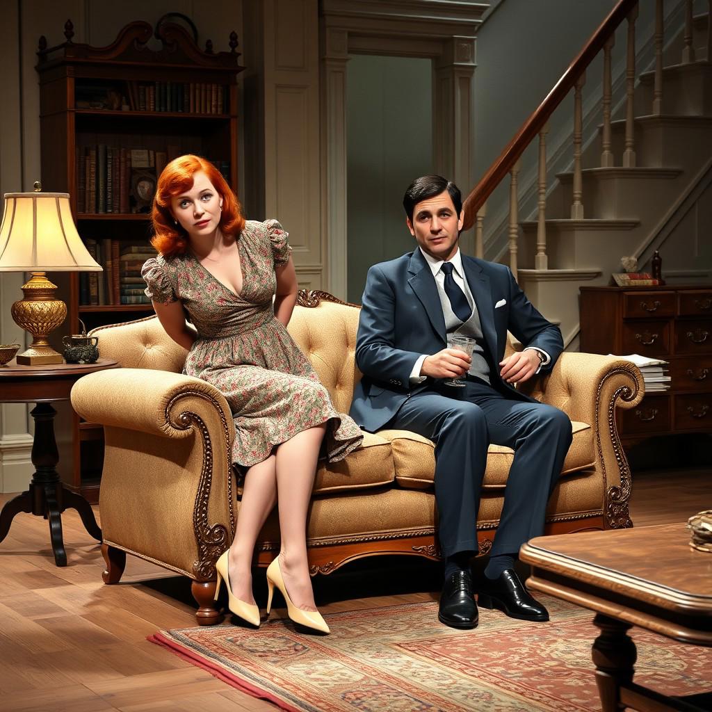 masterpiece portrait of two actors in a stage play scene”::1.4, Norman Rockwell style::1.2, 1930s theatre set art::1.1, (physical description: red-haired woman in a floral or patterned dress with light-colored heels, seated on the armrest of an ornate upholstered sofa, leaning forward with arms behind her back; dark-haired man in a suit and tie, seated on the sofa, leaning back slightly and holding a glass:1.1), (facial features, expression: woman appears animated and expressive; man looks amused, with a hint of curiosity:1.0), (clothing details: floral/patterned vintage dress, light-colored heels; classic 1930s suit and tie:1.0), (accessories: table lamp, bookshelf with books and decorative items, wooden table with drawers, rug on the floor:0.9), (background setting: indoor stage set resembling a 1930s English country manor living room; visible staircase in the background:0.9), (lighting style: warm theatrical stage lighting with soft shadows:0.8), (composition and camera framing: medium-wide shot capturing both characters in context of the detailed stage set:1.0), (emotional tone or theme: comedic murder mystery atmosphere, lively and slightly dramatic:0.9), (technical execution: high-resolution, realistic painting with attention to period detail and texture:0.8)