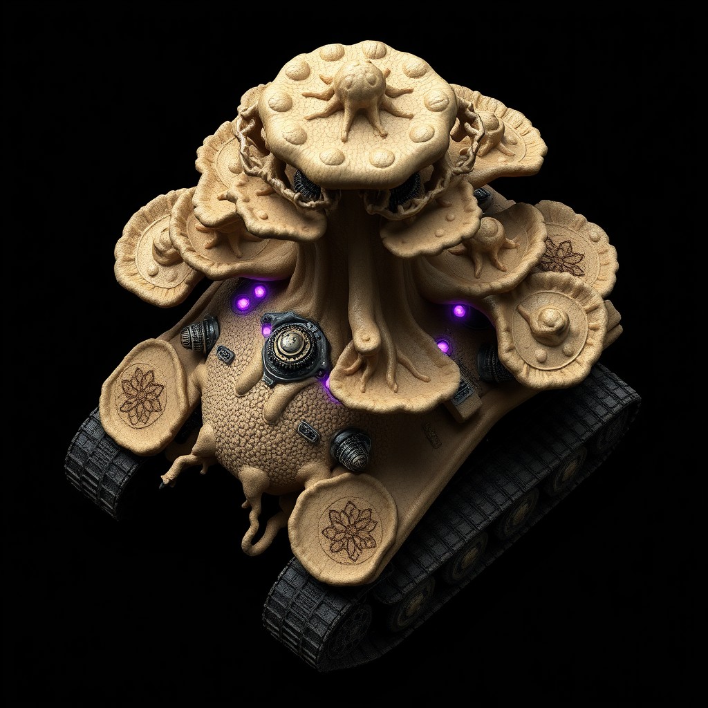 ((top view)), (tank), Tall tank with fungal tower rising from the center and spreading cap-like armor out over the body. Chassis: Coral-like chitin plating, semi-organic with branching root textures. Slight iridescence in shifting light. Tracks: Short, stocky treads with fungal lattice stabilizers over each corner. Details: Central tower leaks bio-mist during idle. Crust-like armor plates pulse faintly as mycelial network reconfigures. Lights: Purple luminescence from fungal nodes. Spore lamps blink in repeating bio-patterns.