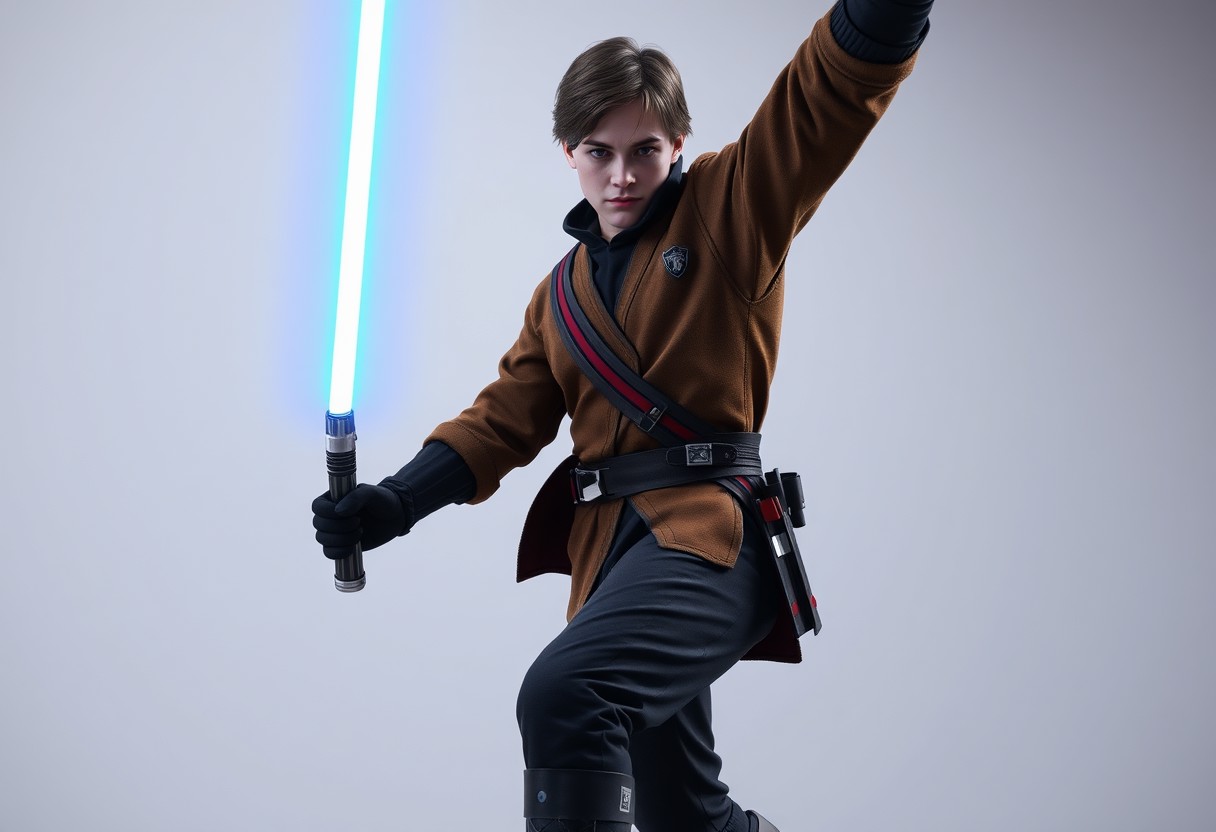 A cinematic photorealistic render of a person in a dynamic action pose, wearing a highly detailed Star Wars-themed costume. The costume features a brown jacket with a red and black sash, black pants, black gloves, and black boots. The textures are incredibly lifelike, showing fine stitching and fabric wear. In their right hand, a blue lightsaber glows intensely, casting captivating lighting on the figure and the environment. They stand against a stark, clean white wall background. Captured with impeccable composition using the Golden Ratio, a creative angle emphasizes the dramatic movement. This is a well-timed moment, rendered in high-res 4K with exceptional quality, lifelike details, super detailed face and eyes, handcrafted with precision. Rendered in the style of Octane Render and Unreal Engine 5, Trending on ArtstationHQ, CGSociety.