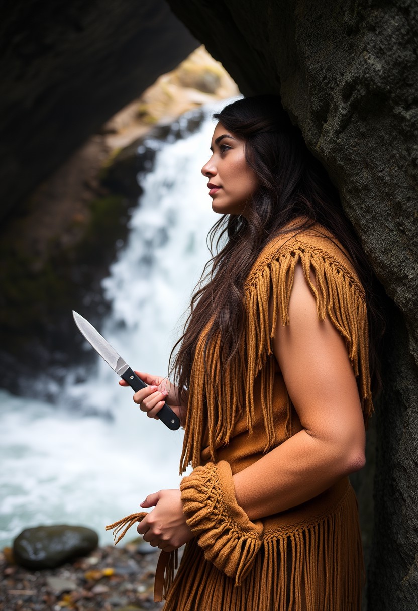beautiful woman, Native American, looking out from a cave behind a waterfall, deerskin clothes, moccasins, scraping knife in one hand, fresh salmon in the other, side view. close up on face and hand