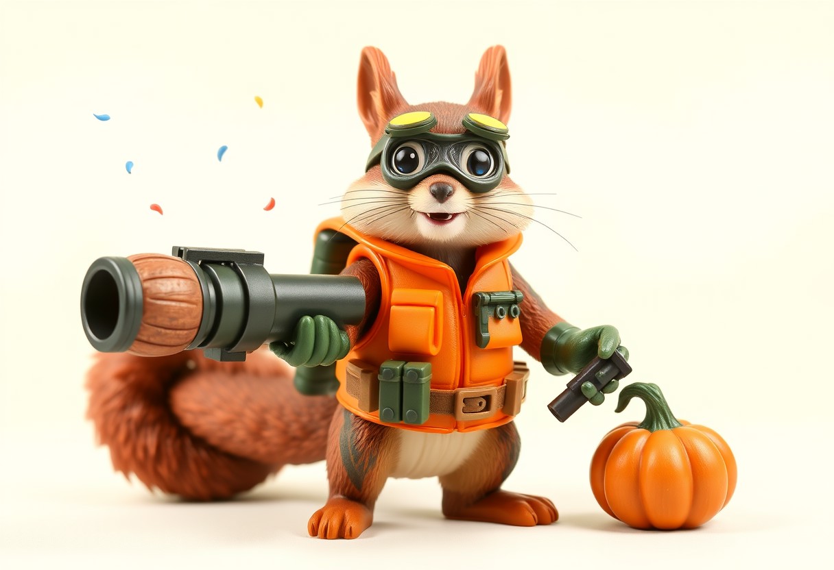 1990s-style action figure toy of an anthropomorphic squirrel dressed as a forest-themed nut defender superhero. The squirrel wears an orange utility vest, forest camo gloves, and goggles, holding a walnut-shell cannon that fires acorn projectiles and confetti nutrient bursts. Stylized accessories mini pumpkin grenades, and a belt of seeds. Bright colors, nostalgic aesthetic, detailed toy design, whimsical and heroic style, bold comic-book shading. Clean background. (No text). Top view. 4:5 aspect ratio --v 5 --style 90s --ar 4:5