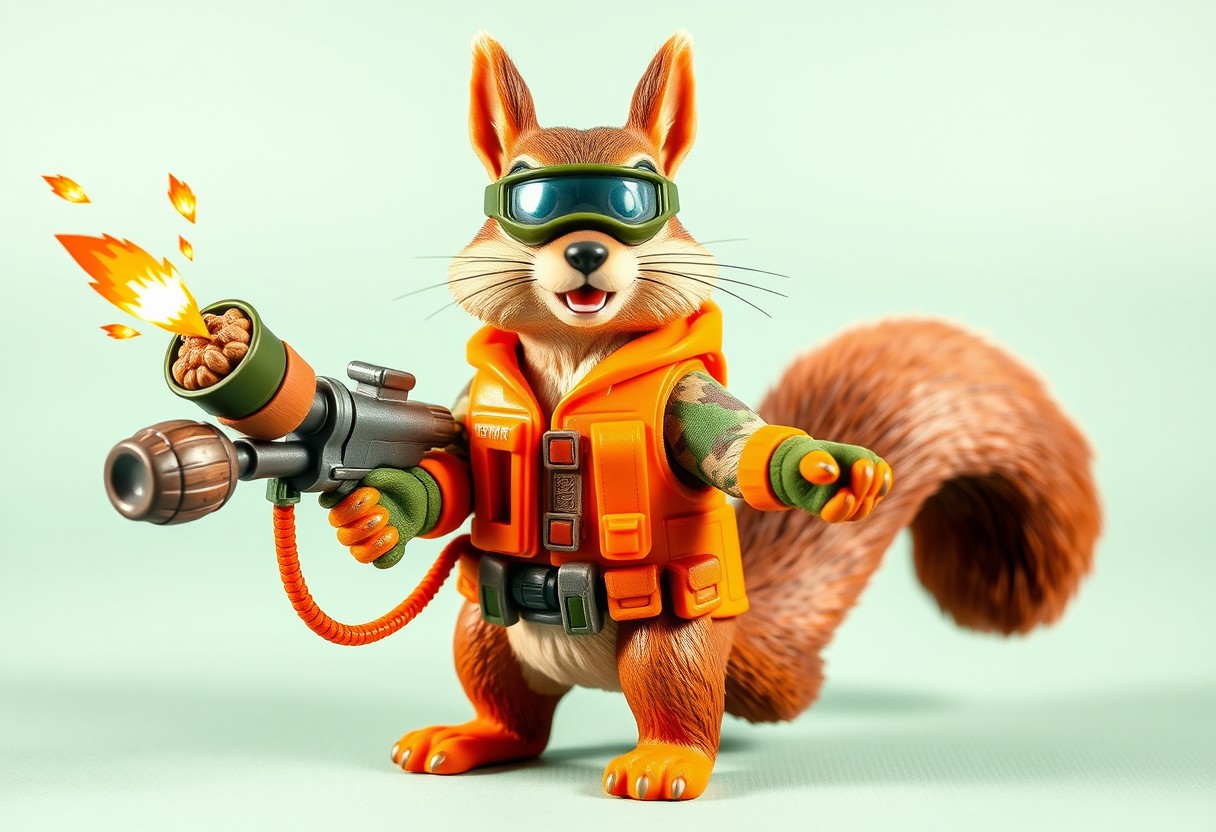 1990s-style action figure toy of an anthropomorphic squirrel dressed as a forest-themed nut defender superhero. The squirrel wears an orange utility vest, forest camo gloves, and goggles, holding a walnut-shell cannon that fires acorn projectiles and confetti nutrient bursts. Stylized accessories mini pumpkin grenades, and a belt of seeds. Bright colors, nostalgic aesthetic, detailed toy design, whimsical and heroic style, bold comic-book shading. Clean background. (No text). Isometric angle. 4:5 aspect ratio --v 5 --style 90s --ar 4:5
