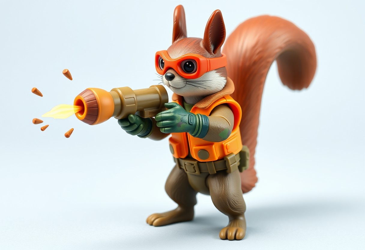 1990s-style action figure toy of an anthropomorphic squirrel dressed as a forest-themed nut defender superhero. The squirrel wears an orange utility vest, forest camo gloves, and goggles, holding a walnut-shell cannon that fires acorn projectiles and confetti nutrient bursts. Stylized accessories mini pumpkin grenades, and a belt of seeds. Bright colors, nostalgic aesthetic, detailed toy design, whimsical and heroic style, bold comic-book shading. Clean background. (No text). Isometric angle. 4:5 aspect ratio --v 5 --style 90s --ar 4:5