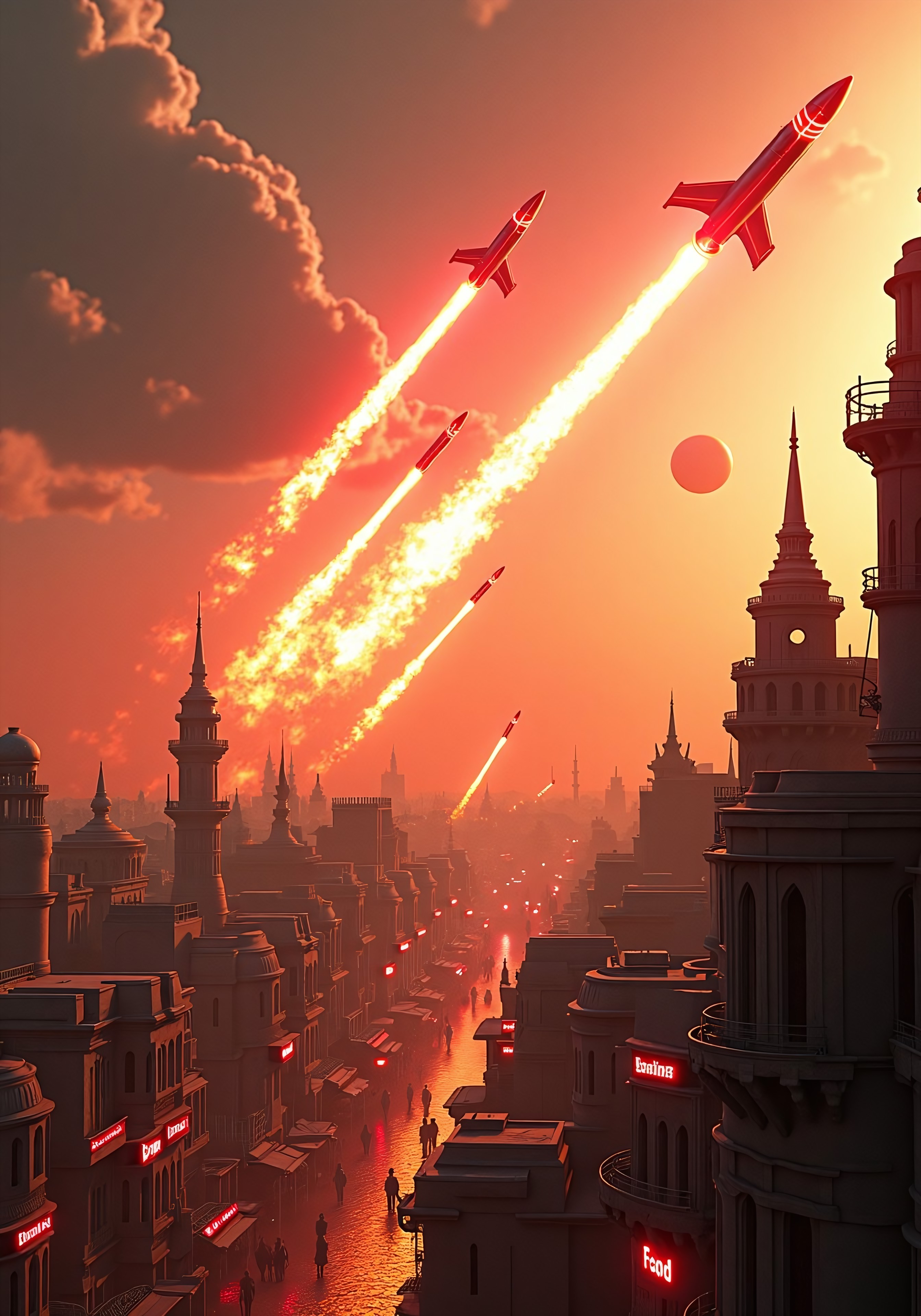 (masterpiece, ultra-HD, best quality, hyper-detailed, photorealistic, cinematic lighting, volumetric light, depth of field, dramatic contrast, rich textures) Scene: hypersonic missiles blazing down from stratosphere, plasma trails ripping through thin clouds, shockwaves distorting air. Missiles glow red-hot, splitting the sky. Foreground: rooftop in Middle East dystopian cyberpunk city, neon Arabic signs flicker, tangled power lines, satellite dishes, dusty drones hover. Midground: bustling streets packed with market stalls, holograms in Arabic, robed figures scatter. Arcologies rise with neon minarets, oil pipelines weave through slums. Background: more missiles streak from high orbit, vapor trails crisscross. Distant sandstorm and faint burning oil fields on horizon. Lighting: harsh neon mixed with dusty amber, glowing particles drift, volumetric rays slice polluted air. Camera: wide-angle, low view looking up, emphasizing terrifying descent, dramatic foreshortening. Style: hard sci-fi, grimdark cyberpunk, Middle Eastern aesthetic, intricate mechanical details, atmospheric haze, cinematic composition, emotional gravity.