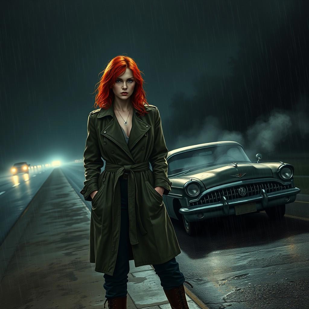 masterpiece portrait of a lone woman with red hair standing on the shoulder of a dark, rain-soaked highway at night::1.4, Greg Rutkowski style::1.2, film noir art::1.1, (physical description: woman with striking red hair, rain-slicked skin and clothes, standing tense and alert beside an old broken-down Buick with steam rising from the hood:1.1), (facial features, expression: pale face lit by approaching headlights, anxious and resolute expression, sharp cheekbones accentuated by wet strands of hair:1.0), (clothing details: damp vintage-style trench coat clinging to her frame, dark trousers, scuffed boots:1.0), (accessories: subtle silver necklace partly hidden by her coat, faint glint of raindrops on her clothes and hair:0.9), (background setting: desolate stretch of Route 9 shrouded in heavy rain and darkness, headlights cutting through the fog, steaming Buick by the roadside:0.9), (lighting style: dramatic, high-contrast lighting from car headlights and dim roadside reflections, moody and cinematic:0.8), (composition and camera framing: slightly low angle, woman off-center framed against the steaming car and road disappearing into darkness:1.0), (emotional tone or theme: suspenseful, mysterious, noir atmosphere of danger and isolation:0.9), (technical execution: highly detailed, realistic textures of wet surfaces, steam effects and headlight beams piercing rain:0.8)