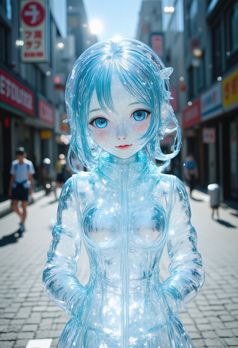 clear_note with subtle film-grain texture, vintage atmosphere, and light rays, with intricate overlay of luminous radiant white line art emphasizing the subject by tracing the detail on their figure,, semi-transparent acrylic figure resembling an anime girl, set against a sunlit urban backdrop with blurred buildings. The character has striking blue hair and wears a shiny, translucent jacket, soft smile, evoking a playful pose. Sunlight filters through the figure, creating reflections and highlights that add depth to the composition. The cobblestone path, illuminated with dappled light, enhances the texture, while the blurred background suggests a lively atmosphere. The style blends hyper-realistic sculpture with anime aesthetics, showcasing influences from contemporary Japanese pop culture. Focus on the sparkling elements, vibrant colors, and lively urban feel for a captivating visual narrative.