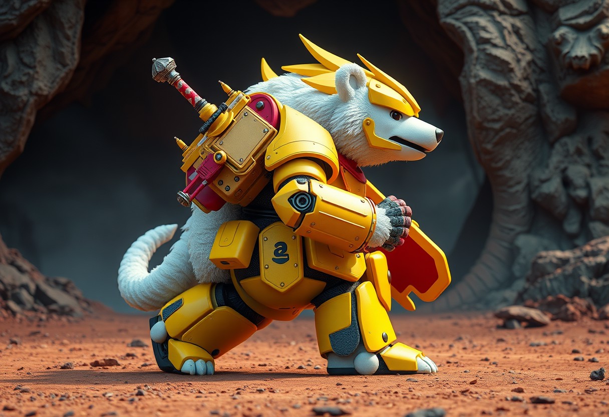 Vibrant yellow Armored White Bear robot, red shield, pink sword, in dynamic action pose on dirt ground, facing right against ominous Cave Dragon background. High-res 4K, Exceptional Quality, Lifelike Details, Super Detailed Eyes, Stunning Harmonious Multi Colors. Beautiful Matte Painting, Impeccable Golden Ratio Composition, Creative Angle, Captivating Cinematic Lighting. Octane Render, Unreal Engine 5, Splash Ink Illustration. Trending on ArtstationHQ, CGSociety. Raphael Style influence, Houdini Style complexity. Handcrafted detail, sharp lines. Playful imaginative scene.