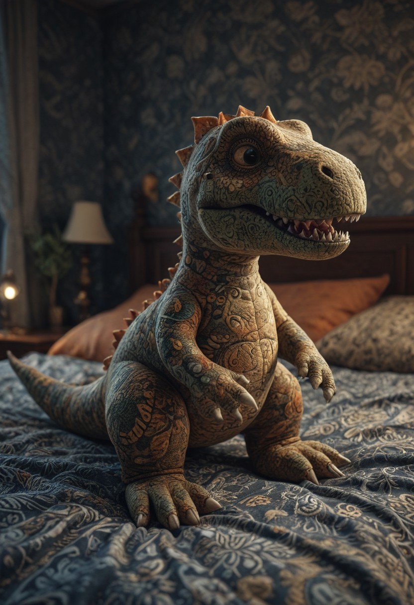 a cute plush t-rex dinosaur made out of batik fabrics, on the bed, cozy room background, masterpiece, 8k, octane render, ultra detailed, cinematic, Masterpiece, 3d octane render, hyperrealistic, High Detail, moody