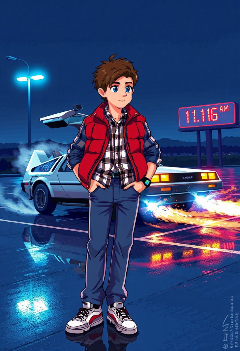 pixel art image inspired by 'Back to the future,' featuring the iconic DMC DeLorean. To the right, A teenage boy with a confident, slightly rebellious attitude. He has a lean build, short brown hair styled in a casual, feathered manner, and expressive eyes. He wears a signature layered outfit: a red puffer vest over a light blue denim jacket, with a white and black plaid button-down shirt underneath. His jeans are slightly faded and straight-cut, and wears white Nike sneakers with red swooshes. On his wrist is a digital watch. A dramatic, cinematic nighttime scene outside the Twin Pines Mall parking lot, glowing under the harsh, bluish light of overhead street lamps. The vast, empty lot stretches into the distance, wet pavement reflecting the cool light and adding a glossy sheen. In the background, the DeLorean is parked with its gull-wing doors open, steam and sparks rising from its body as it emits glowing blue electrical arcs. Its tires glow with fire trails, hinting at a recent jump through time. Behind it, the mall sign reads “Twin Pines Mall” with the time "1:16 AM" lit in digital numbers. The horizon glows faintly with lightning flashes, and distant mountains loom in silhouette. the atmosphere capture the thrill and mystery of time travel. limited retro color palette (8-bit or 16-bit), dithering for shading, and clean, blocky pixel lines for a nostalgic 80s-90s video game aesthetic. Keep details simplified with visible pixels for an authentic pixel art style.