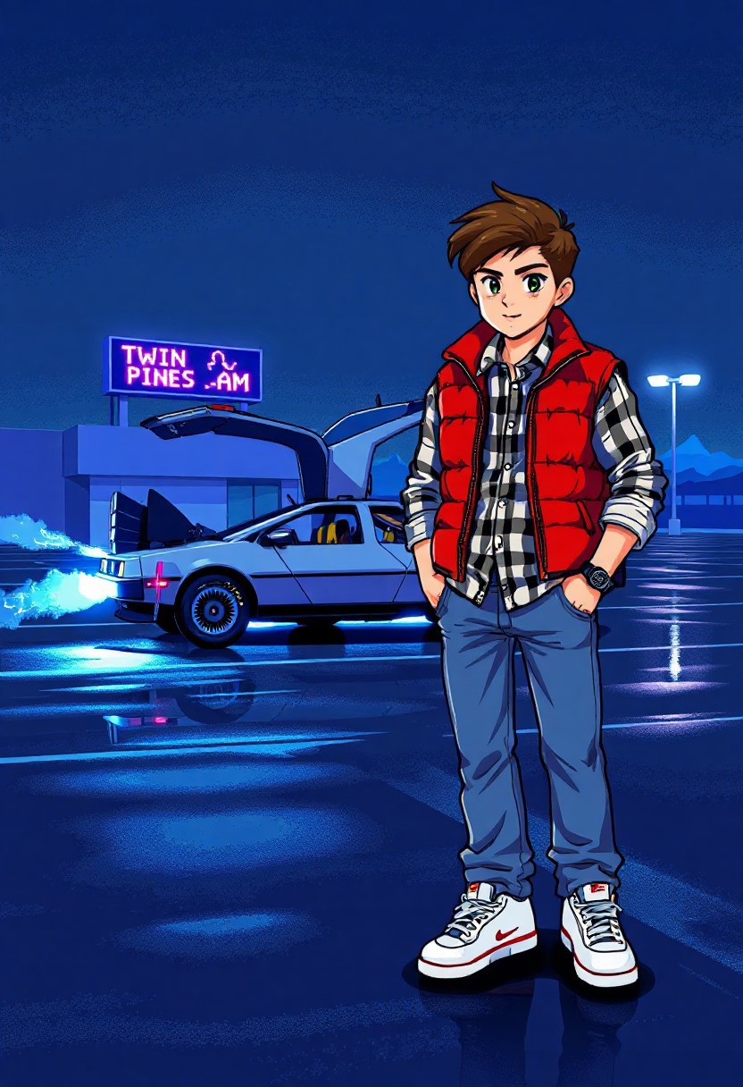 pixel art image inspired by 'Back to the future,' featuring the iconic DMC DeLorean. To the right, A teenage boy with a confident, slightly rebellious attitude. He has a lean build, short brown hair styled in a casual, feathered manner, and expressive eyes. He wears a signature layered outfit: a red puffer vest over a light blue denim jacket, with a white and black plaid button-down shirt underneath. His jeans are slightly faded and straight-cut, and wears white Nike sneakers with red swooshes. On his wrist is a digital watch. A dramatic, cinematic nighttime scene outside the Twin Pines Mall parking lot, glowing under the harsh, bluish light of overhead street lamps. The vast, empty lot stretches into the distance, wet pavement reflecting the cool light and adding a glossy sheen. In the background, the DeLorean is parked with its gull-wing doors open, steam and sparks rising from its body as it emits glowing blue electrical arcs. Its tires glow with fire trails, hinting at a recent jump through time. Behind it, the mall sign reads “Twin Pines Mall” with the time "1:16 AM" lit in digital numbers. The horizon glows faintly with lightning flashes, and distant mountains loom in silhouette. the atmosphere capture the thrill and mystery of time travel. limited retro color palette (8-bit or 16-bit), dithering for shading, and clean, blocky pixel lines for a nostalgic 80s-90s video game aesthetic. Keep details simplified with visible pixels for an authentic pixel art style.