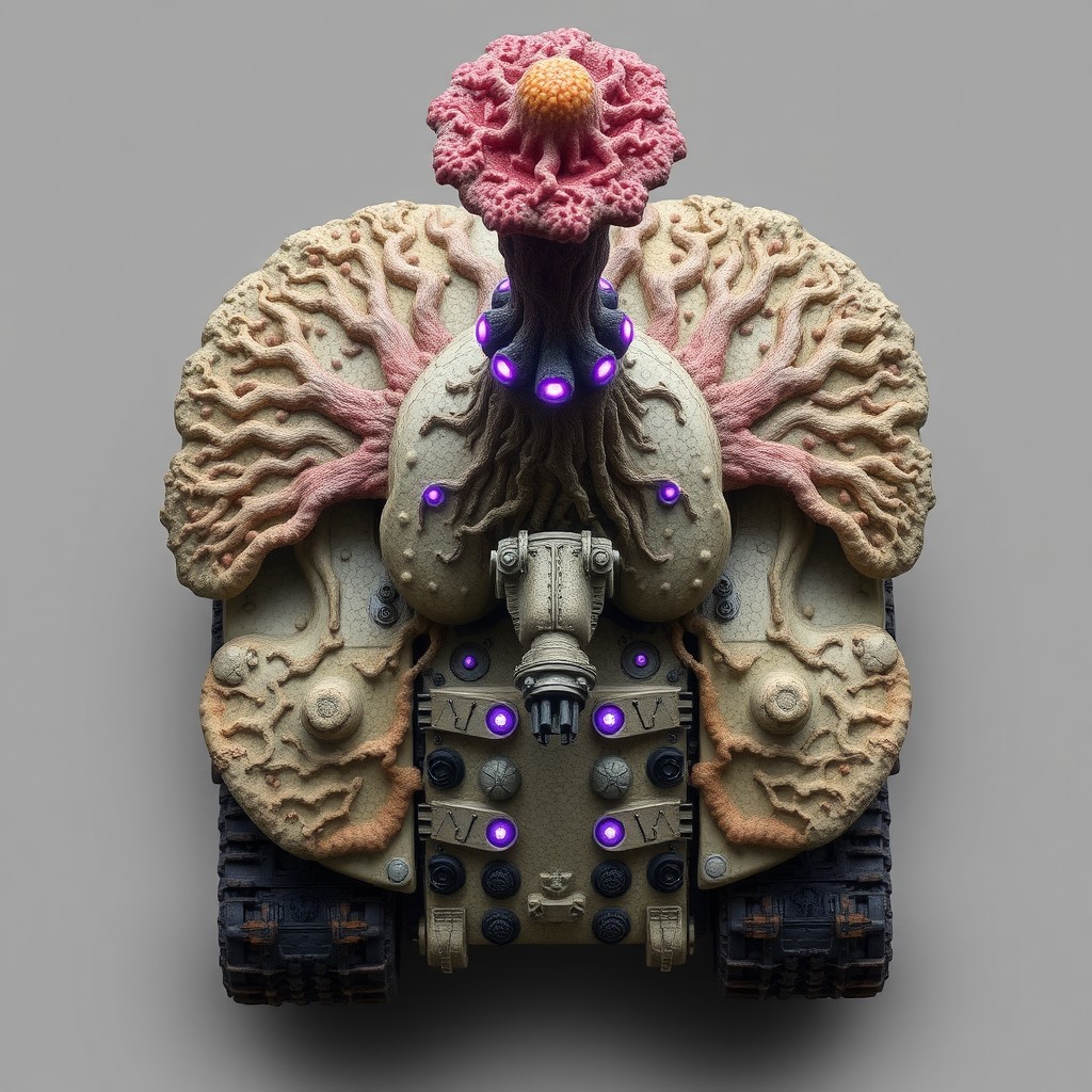 ((top view)), (tank), Tall tank with fungal tower rising from the center and spreading cap-like armor out over the body. Chassis: Coral-like chitin plating, semi-organic with branching root textures. Slight iridescence in shifting light. Tracks: Short, stocky treads with fungal lattice stabilizers over each corner. Details: Central tower leaks bio-mist during idle. Crust-like armor plates pulse faintly as mycelial network reconfigures. Lights: Purple luminescence from fungal nodes. Spore lamps blink in repeating bio-patterns.