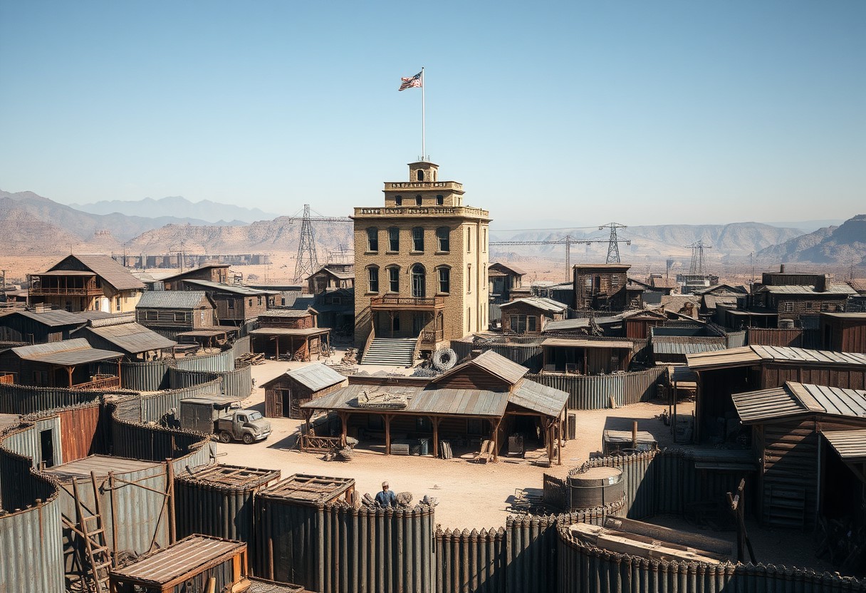 Junktown-inspired town, scrap metal walls encircling the settlement, ramshackle buildings constructed from corrugated iron and salvaged materials, few wooden buildings in a Wild West style scattered throughout, prominent two-story concrete town hall dominating the skyline, dystopian setting, post-apocalyptic, midday sun casting harsh shadows, gritty details, atmospheric perspective