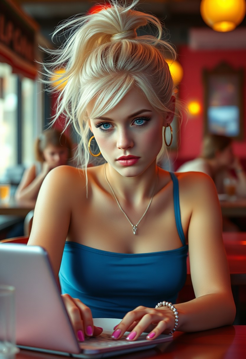 A petite, youthful blonde woman sits at a cozy café table, her bleach-blonde hair pulled up into a high ponytail that sways gently with every subtle movement. Her pale blue eyes are striking, framed by sharp eyeliner and filled with quiet focus as she stares in horror at her plate of grilled frog. Her realistic skin glows under soft, cinematic lighting, revealing a flawless complexion, delicate dimples, and luscious pink lips slightly parted in concentration. She wears a fitted blue cropped tank top that accentuates her figure, with hoop earrings catching the light and a dainty necklace resting just above her collarbone. A bracelet shimmers on her wrist as she types. The atmosphere around her is warm and vivid, bathed in rich rainbow-toned lighting. In the background, people sip their drinks and chat, their presence adding a sense of everyday life to this vibrant, professional-quality 35mm photograph.