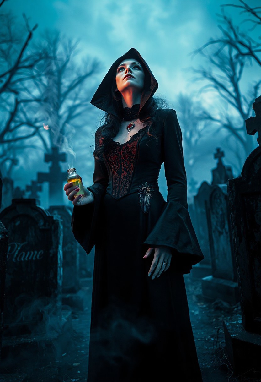 "In a realm of perpetual twilight, where the Night of the Hunt era cast its macabre shadow, a vision of elegance emerged from the darkness. Clad in the imposing garb of an Executioner, she stood like a specter amidst the decrepit tombstones, her beauty a haunting counterpoint to the malevolence that seemed to seep from every stone. A haze of burning incense wafted around her, its sweet scent a stark contrast to the putrid air heavy with the whispers of the damned. In one hand, she grasped a delicate vial filled with a pale, viscous liquid – a token of her macabre pursuits. Her eyes, cast heavenward in silent supplication, seemed to hold a secret sorrow, even as a blood-drunk smile twisted across her lips like a promise of dark delight. The camera's gaze fell upon her from an unnatural angle, as if the very tombstones themselves were conspiring against all sense of decorum. Fog swirled around her ankles like a living entity, choking out all sound save for the whispers that seemed to emanate from the shadows themselves. A gleaming crow-feather brooch pinned to her breast seemed a mocking touch of elegance in a world gone mad."