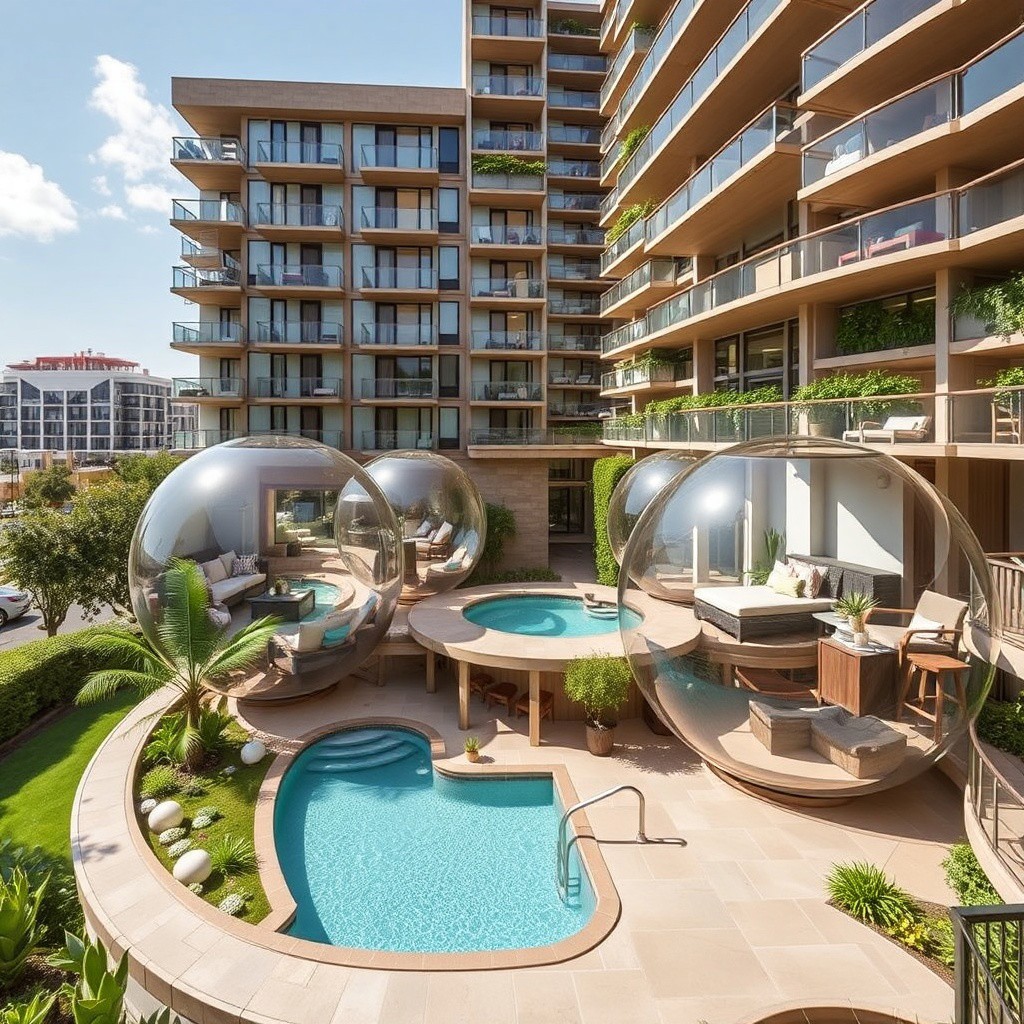 Inside a 10-story mixed-use building that inspires the idea of a bubble, each sphere is an apartment with a garden, pool and amenities in Palisades, California, and creates a sense of separation from each other.