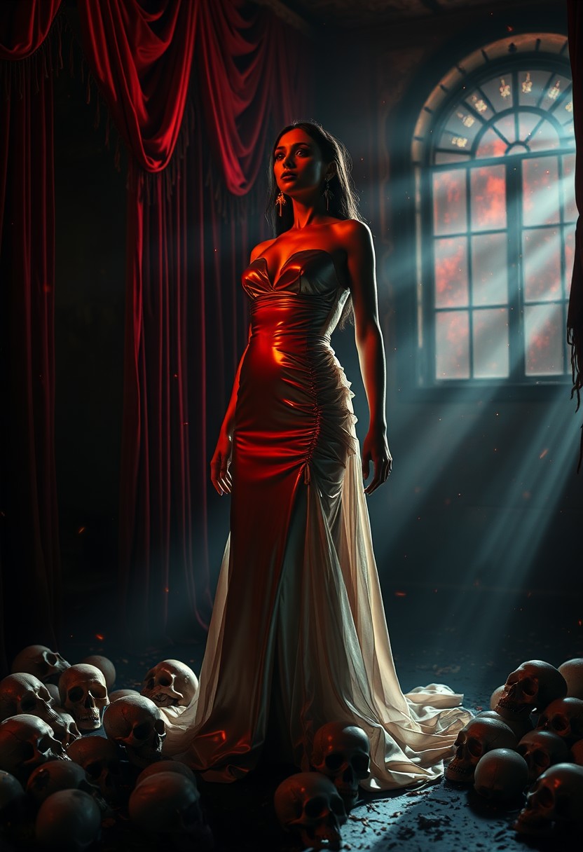 "A vision of ethereal beauty emerges from the shadows of a forsaken asylum, where tattered velvet curtains conceal secrets and darkness reigns supreme. In the Distorted Present era, she stands poised, her figure clad in a majestic Latex dress that seems to shimmer with an otherworldly essence. Fiery backlight casts an eerie glow upon her skin, imbuing her with an aura of divine obsession. As she kneels, surrounded by skulls that seem to hum in reverence, her countenance is set aflame with an expression of transcendental ecstasy. The air is alive with strange, glowing particles that dance like spectral fireflies, as if the very fabric of reality has been infused with an eldritch energy. Bone earrings glint like moonlit serpents, framing a face that shines with an unearthly light, bathed in the macabre beauty of an abandoned asylum's dark corridors."