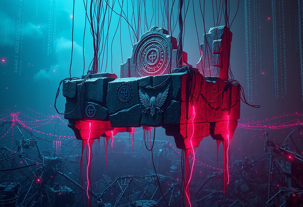A surreal altar-like structure composed of shattered cybernetic material and fractured stone monoliths, floating in midair over a flickering data abyss. The structure is suspended by broken wires and bleeding fiber-optic veins, glowing with red and violet pulses. Ancient symbols burned into the surfaces shimmer faintly. Surrounding the scene is a storm of fragmented code, twisted rebar, and echoes of machinery caught in an infinite glitch loop. Dramatic ambient lighting. Techno-occult cathedral aesthetic. High-resolution cinematic frame