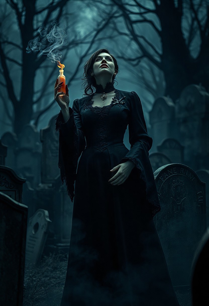 "In a realm of perpetual twilight, where the Night of the Hunt era cast its macabre shadow, a vision of elegance emerged from the darkness. Clad in the imposing garb of an Executioner, she stood like a specter amidst the decrepit tombstones, her beauty a haunting counterpoint to the malevolence that seemed to seep from every stone. A haze of burning incense wafted around her, its sweet scent a stark contrast to the putrid air heavy with the whispers of the damned. In one hand, she grasped a delicate vial filled with a pale, viscous liquid – a token of her macabre pursuits. Her eyes, cast heavenward in silent supplication, seemed to hold a secret sorrow, even as a blood-drunk smile twisted across her lips like a promise of dark delight. The camera's gaze fell upon her from an unnatural angle, as if the very tombstones themselves were conspiring against all sense of decorum. Fog swirled around her ankles like a living entity, choking out all sound save for the whispers that seemed to emanate from the shadows themselves. A gleaming crow-feather brooch pinned to her breast seemed a mocking touch of elegance in a world gone mad."