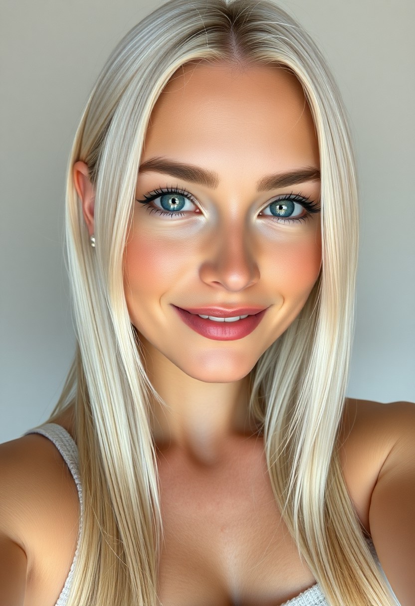 (female), (25 years old), (piercing icy blue eyes), (straight platinum blonde hair, perfectly styled), (toned and curvy body, athletic yet feminine), (natural soft lighting), (smooth hyper-realistic skin, with natural imperfections), (minimal natural makeup), (confident photogenic smile), (selfie pose, slightly tilted head), (neutral soft-focus background), (ultra-high resolution), (photorealistic), (soft neutral color palette), (casual trendy outfit), (minimal jewelry), (no heavy digital edits), (no unrealistic proportions), (Instagram selfie aesthetic), (influencer vibe), (modern, confident, approachable)
