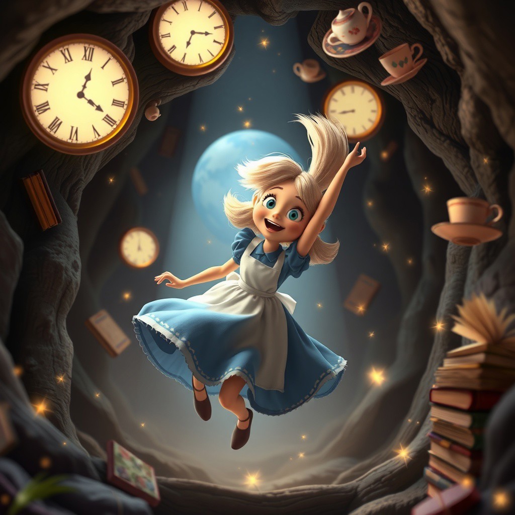 Pixar-style animated scene of a curious blonde girl in a blue dress with white apron falling down a glowing rabbit hole surrounded by floating clocks, teacups, books, and sparkles. Her hair and skirt flow upward, her face amazed and excited. Warm magical lighting, cinematic 3D look