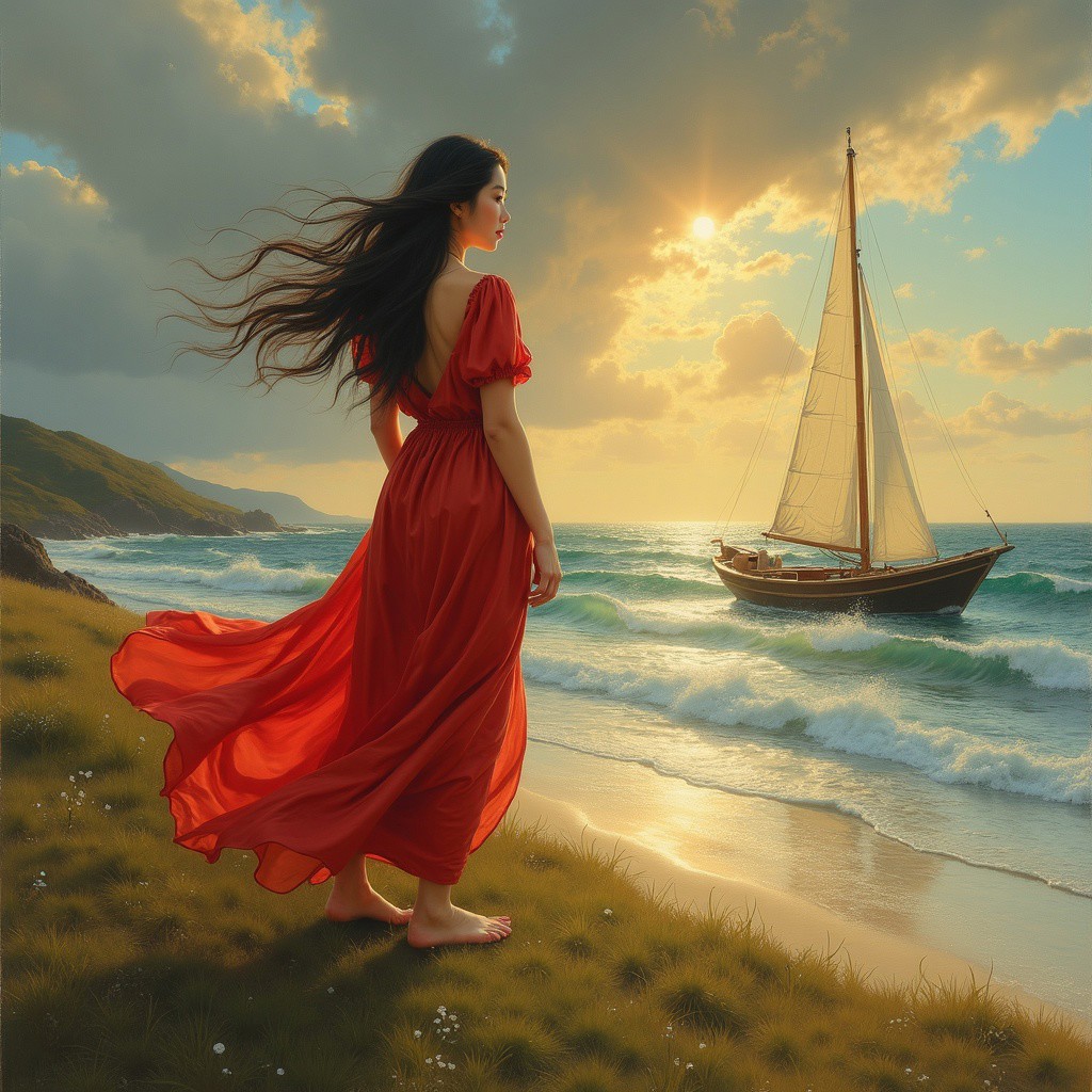 a beautiful full-figured Korean woman standing barefoot on a grassy hill overlooking the ocean, wearing a red silky leather dress that shimmers in sunlight, soft wind blowing through her long black hair, a small wooden sailboat resting on the shore below, waves gently crashing, warm golden afternoon sky, oil painting, highly detailed brushwork, serene expression, coastal landscape, cinematic composition, sunlight reflections on water and fabric, traditional fine art style, vibrant yet realistic colours, beautiful woman, chubby girl, Korean girl, red silk dress, windy dress, barefoot, ocean view, beach hill, traditional sailboat, crashing wave, golden sky, oil painting, classical style, realistic art, shoreline, fine art, boat on beach, serene mood, high detail, vibrant realism, glowing highlights, scenic coast, moody ocean under dark sky, storm clouds forming, wind-lashed waves, dramatic lighting, eerie quiet, foreboding atmosphere, stormy weather, moody lighting, cinematic storm, dramatic contrast, tension buildup