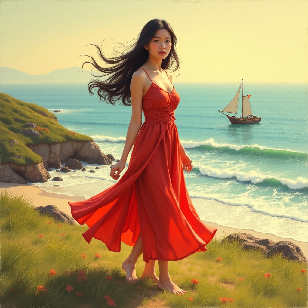 a beautiful full-figured Korean woman standing barefoot on a grassy hill overlooking the ocean, wearing a red silky leather dress that shimmers in sunlight, soft wind blowing through her long black hair, a small wooden sailboat resting on the shore below, waves gently crashing, warm golden afternoon sky, oil painting, highly detailed brushwork, serene expression, coastal landscape, cinematic composition, sunlight reflections on water and fabric, traditional fine art style, vibrant yet realistic colours, beautiful woman, chubby girl, Korean girl, red silk dress, windy dress, barefoot, ocean view, beach hill, traditional sailboat, crashing wave, golden sky, oil painting, classical style, realistic art, shoreline, fine art, boat on beach, serene mood, high detail, vibrant realism, glowing highlights, scenic coast, 80s retro poster aesthetic, neon color palette, stylized outlines, cinematic glow, exaggerated lighting, nostalgic tone, pop art influence, retro design, neon lights, stylized, poster art, vintage tones, bold lines