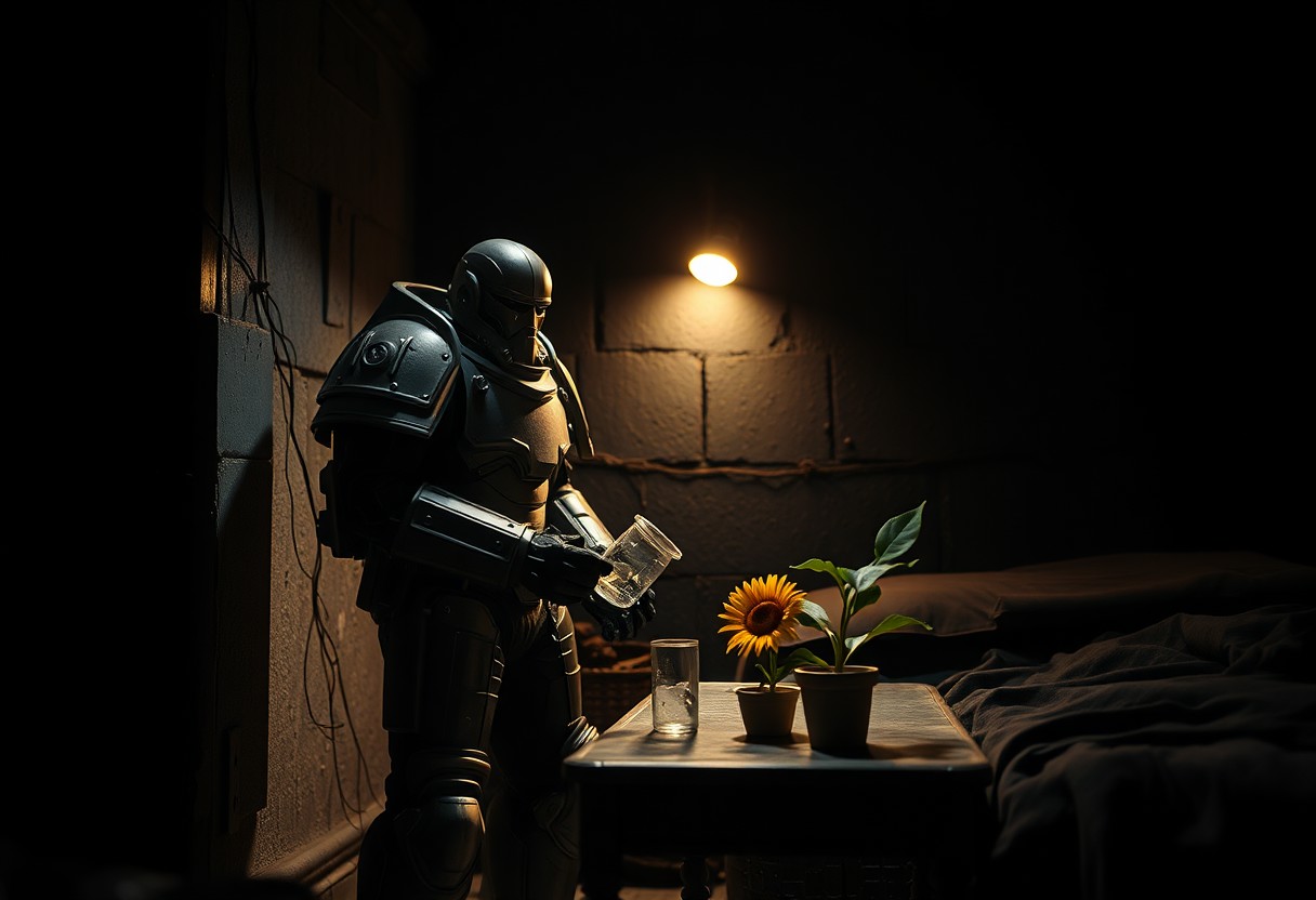 in the grim darkness of the far future there is only war. but one single UltraM40k man stands in his small dark room and waters his tiny Sunflower on the metal table next to his black bedroll. cold dimm light illuminates the trist room and his grim but somehow happy look. his power armor is clean and shows every detail and every crack and bullet hole from the fights he has barely won. sharp shadows empowering the contrast of the low angle shot,. Shot with a full-frame DSLR, 85mm lens at f/1.8 for shallow depth of field, ISO 400, 1/100 shutter speed. Cold dimm light enhanced with slight post-processing contrast boost and neutral tone grading. balancing sci-fi horror with dark fantasy. dark gothic warhammer30k theme.