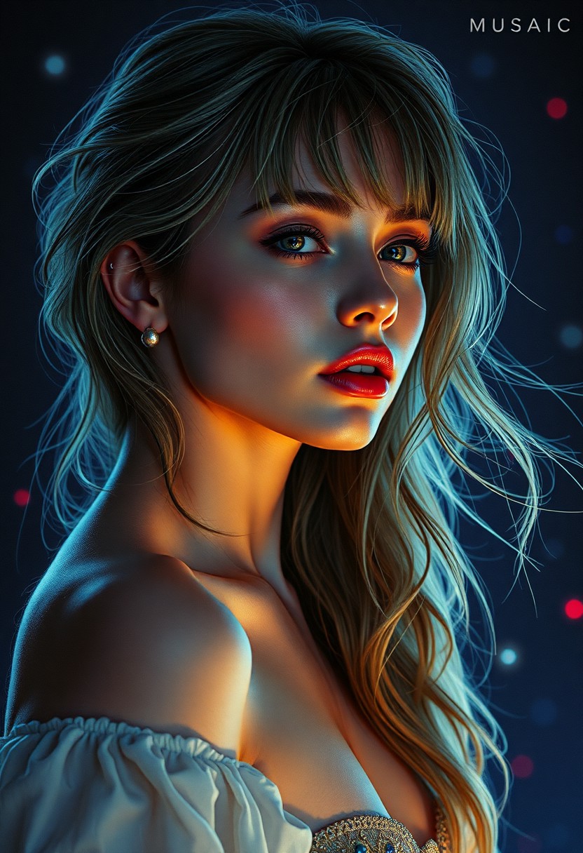 high quality design aesthetics, disco, synth pop, dynamic, detailed, pop album cover, melancholic, beautiful young white woman, artist name "Musaic", album title "Into The Night"