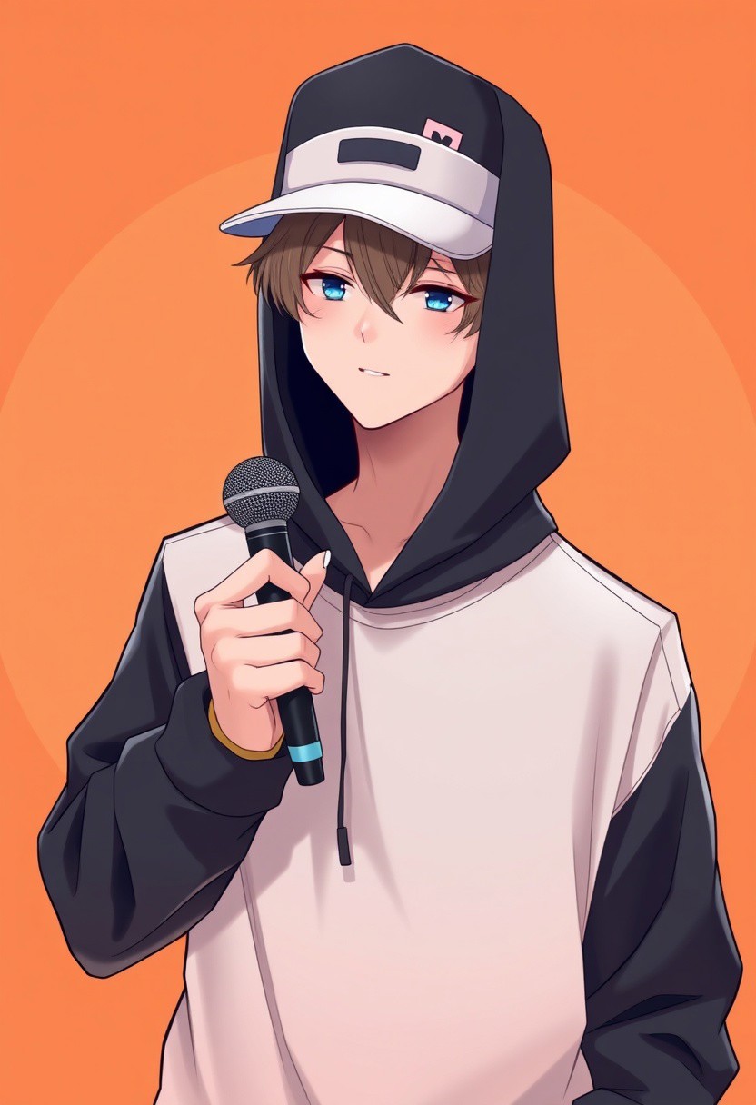 anime male 25 years old, minimalistic art style, wearing snapback and black hood, full body height, holding mic, orange background