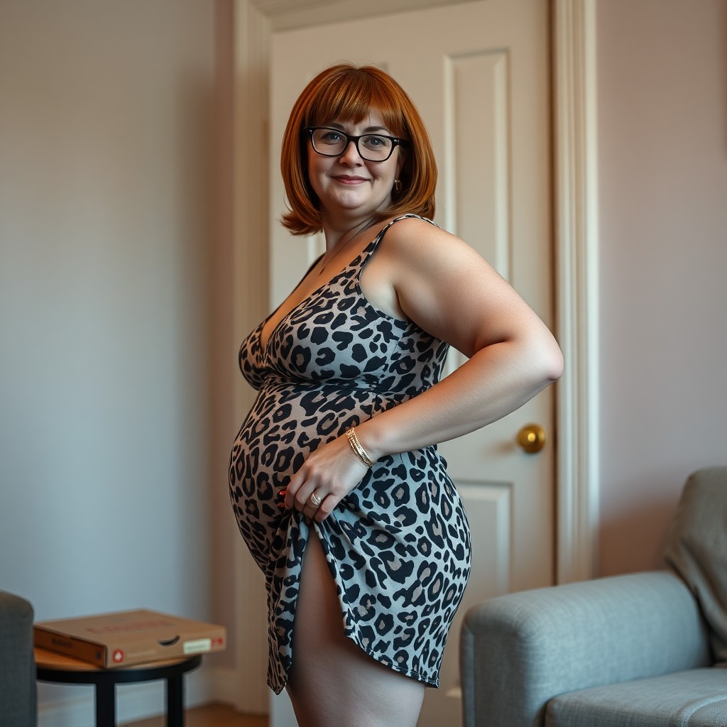 full body shot chubby woman forty years old 5'7" red shoulder length hair glasses animal print mini dress, interior view livingroom door closed behind her pizza box on table beside door pulling up skirt past thigh